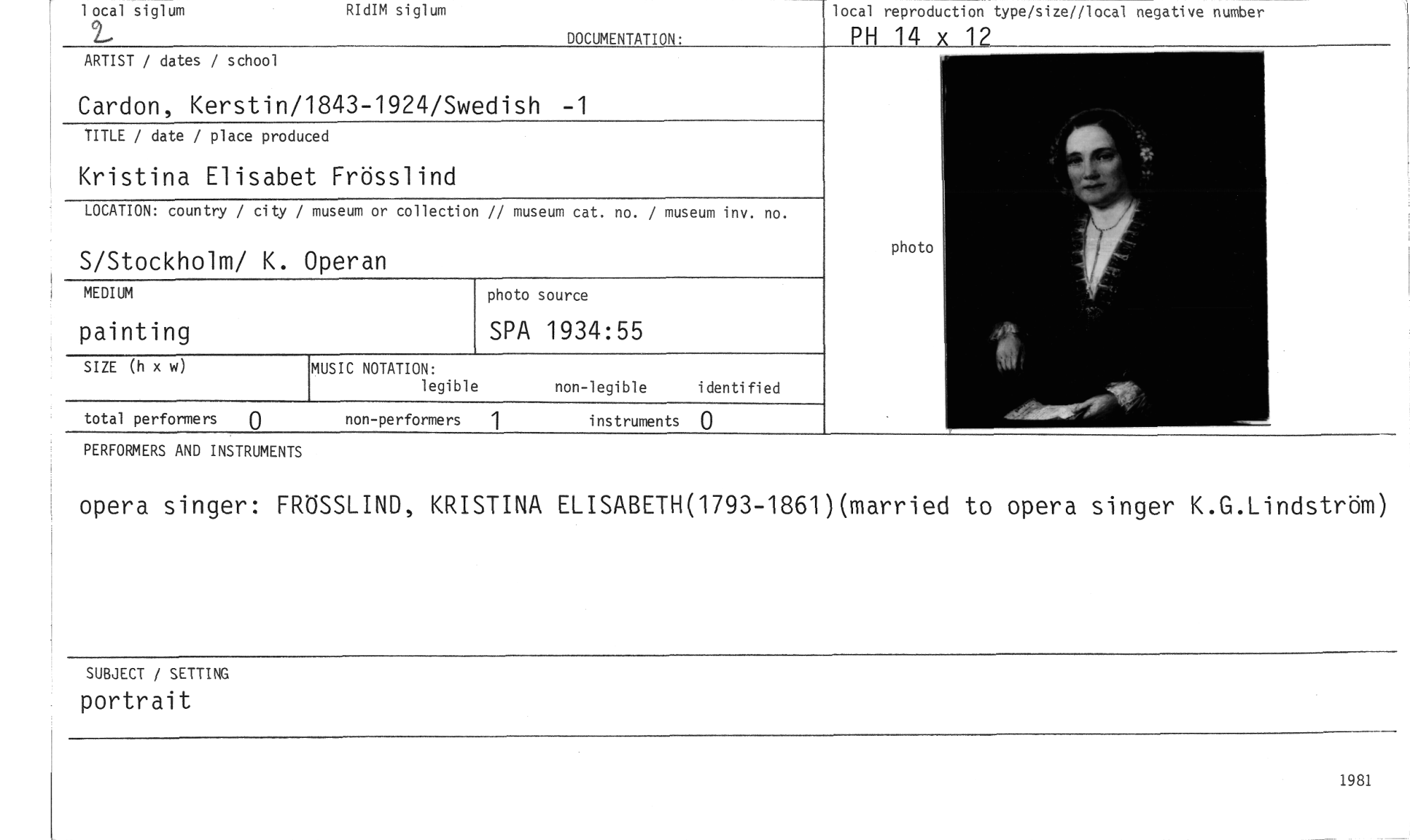 //// local reproduction type/size//local negative number //// PH 14 x 12 //// 1981 //// 1 ocal siglum //// 2, //// RIdIM siglum //// DOCUMENTATION: //// non-performers 1 instruments 0 //// total performers 0 //// MUSIC NOTATION: //// legible //// non-legible identified //// photo //// ARTIST / dates / school //// Cardon, Kerstin/1843-1924/Swedish - //// TITLE / date / place produced //// Kristina Elisabet Frösslind //// LOCATION: country / city / museum or collection // museum cat. no. / museum inv. no. //// S/Stockholm/ K. Operan //// photo source //// SPA 1934:55 //// SIZE (h x w) //// PERFORMERS AND INSTRUMENTS //// opera singer: FRÖSSLIND, KRISTINA ELISABETH(1793-1861)(married to opera singer K.G.Lindström) //// SUBJECT / SETTING //// portrait //// MEDIUM //// painting ////