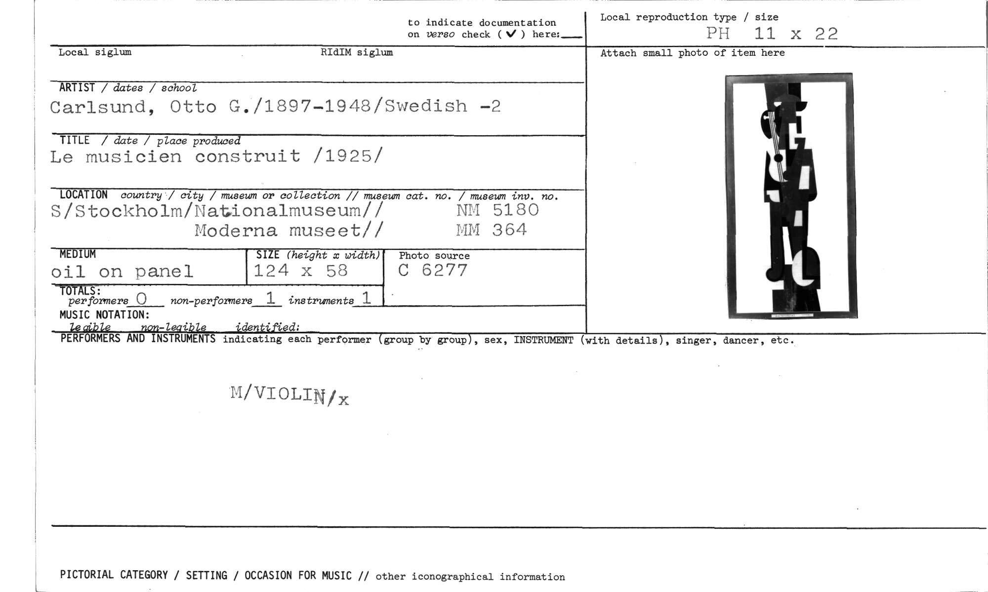 //// to indicate documentation //// on verso check (V ) here:_ //// Local reproduction type / size //// PH 11 x 22 //// Local siglum RIdIM siglum //// Attach small photo of item here //// ARTIST / dates / school //// Carlsund, Otto G./1897-1948/Swedish -2 //// TITLE / date / place produced //// Le musicien construit /1925/ //// LOCATION country / city / museum or collection // museum cat. no. / museum ulv. no. //// S/Stockholm/Nationalmuseum// NM 5180 //// Moderna museet!! MM 364 //// MEDIUM //// oil on panel //// TOTALS: //// per formers 0 non-perfOrmers 1 instruments 1 //// MUSIC NOTATION: //// led ble non-leaible identified: //// PERFORMERS AND INSTRUMENTS indicating each performer (group by group), sex, INSTRUMENT (with details), singer, dancer, etc. //// M/VIOLIN/x //// 124 x 58 //// SIZE (height x width) //// Photo source //// C 6277 //// PICTORIAL CATEGORY / SETTING / OCCASION FOR MUSIC // other iconographical information ////