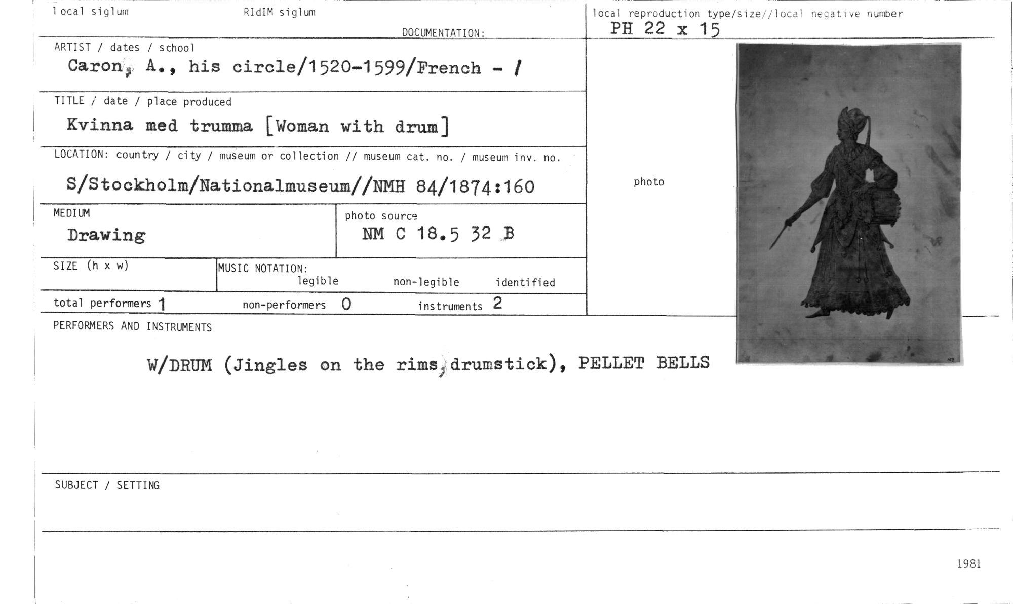 //// SUBJECT / SETTING //// local reproduction type/size.,'local negative number //// PH 22 x 15 //// 1 ocal siglum RIdIM siglum //// DOCUMENTATION: //// ARTIST / dates / school //// Carons A., his circle/1520-1599/French - / //// TITLE / date / place produced //// Kvinna med trumma [Woman with dram] //// LOCATION: country / city / museum or collection // museum cat. no. / museum inv. no. //// S/Stookholm/Nationalmuseum//NMH 84/1874:160 //// MEDIUM //// Drawing //// SIZE (h x w) //// photo //// total performers 1 //// PERFORMERS AND INSTRUMENTS //// non-performers 0 instruments 2 //// W/DRUM (Jingles on the rims;drumstick), PELLET BELLS //// 1981 ////