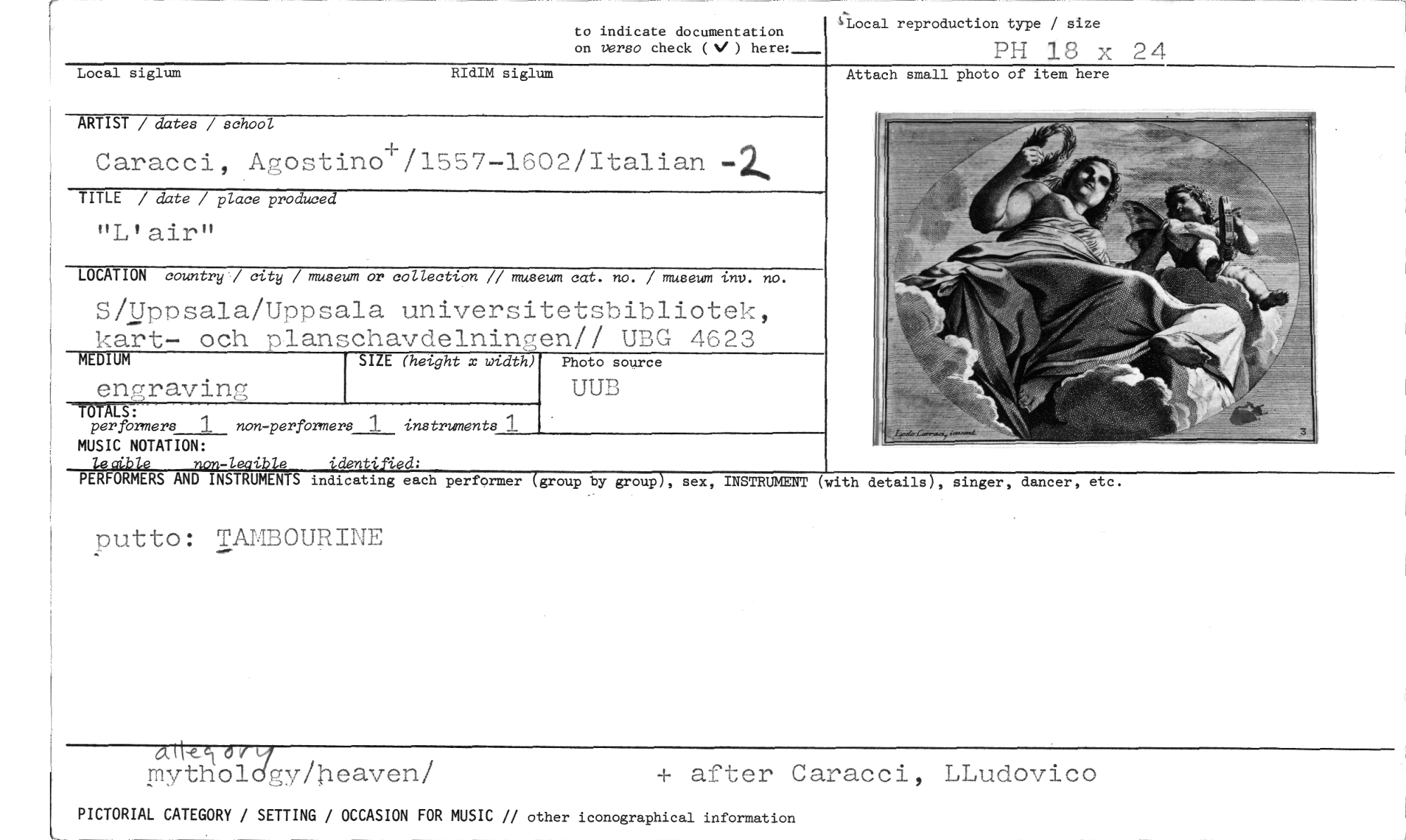 //// to indicate documentation //// on vers, check (V ) here:_ //// SLoc al reproduction type / size //// PH 18 x 24 //// ARTIST / dater / school //// Caracci, Agostino171557-1602/Italian - //// TITLE / date / place produced //// "L' air" //// LOCATION country / city / museum or collection // museum cat. no. / museum Inv. no. //// S/Upcsala/Uppsala universitetsbibliotek, kart- och planschavdelningen// UBG 4623 //// MEDIUM SIZE (height x width) Photo source //// ensravin, UUB //// —W ALS: //// per formers 1 non-perfbrmers 1 instruments 1 //// MUSIC NOTATION: //// Attach small photo of item here //// Local siglum //// RIdIM siglum //// non-lecible identified: //// PERFORMERS AND INSTRUMENTS indicating each performer rgroup by group), sex, INSTRUMENT //// putto: TAMBOURINE //// (with details), singer, dancer, etc. //// 4v-cc-loft-y //// MYtholdgy/heaven/ + after Caracci, LLudovico //// PICTORIAL CATEGORY / SETTING / OCCASION FOR MUSIC // other iconographical information ////