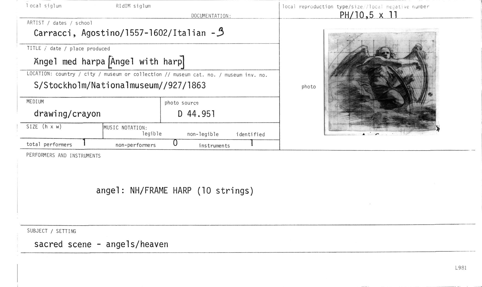 //// 1 ocal siglum RIdIM siglum //// DOCUMENTATION: //// lotal reproduction type/size//local nega ve nutuber //// PH/10.5 x 11 //// ARTIST / dates / school //// Carracci, Agostino/1557-1602/Italian //// TITLE / date / place produced //// Ängel med harpa [Ångel with harp] //// LOCATION: country / city / museum or collection // museum cat. no. / museum inv. no. //// S/Stockholm/Nationalmuseum//927/1863 //// MEDIUM //// drawing/crayon //// SIZE (h x w) //// non-legible identified //// photo source //// D 44.951 //// MUSIC NOTATION: //// legible //// photo //// total performers 1 //// non-performers instruments //// PERFORMERS AND INSTRUMENTS //// angel: NH/FRAME HARP (10 strings) //// SUBJECT / SETTING //// sacred scene - angels/heaven //// L981 ////