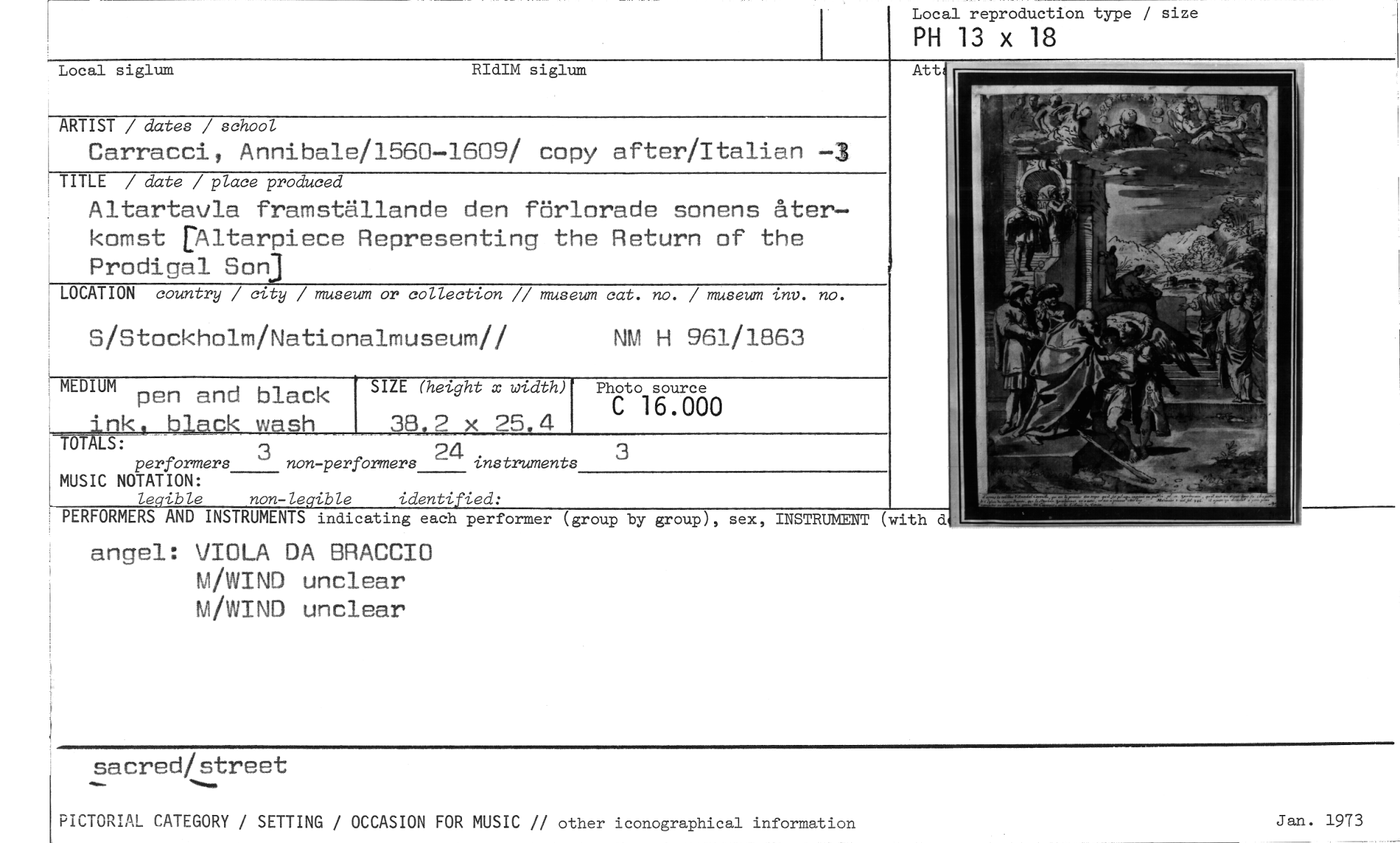 //// Local reproduction type / size //// PH 13 x 18 //// Local siglum RIdIM siglum //// Att //// ARTIST / dates / school //// Carracci, Annibale/1560-1609/ copy after/Italian —3 //// TITLE / date / place produced //// Altartavla framställande den förlorade sonens återkomst [Altarpiece Representing the Return of the Prodigal Son,) //// LOCATION country / city / museum or collection // museum cat. no. / museum inr. no. //// S/Stockholm/Nationalmuseum// NM H 961/1863 //// SIZE (height x width) //// 38,2 x 25.4 //// MEDIUM pen and black nk taack wash //// TOTALS: //// 3 24. //// ph,dtolgu.r.660 3 //// performers non -performers instruments //// MUSIC NOTATION: //// legible non -legible identified: //// PERFORMERS AND INSTRUMENTS indicating each performer //// angel: VIOLA DA BRACCIO //// M/WIND unclear M/WIND unclear //// (group by group), sex, INSTRUMENT (with d //// sacred/street //// PICTORIAL CATEGORY / SETTING / OCCASION FOR MUSIC // other iconographical information //// Jan. 1973 ////