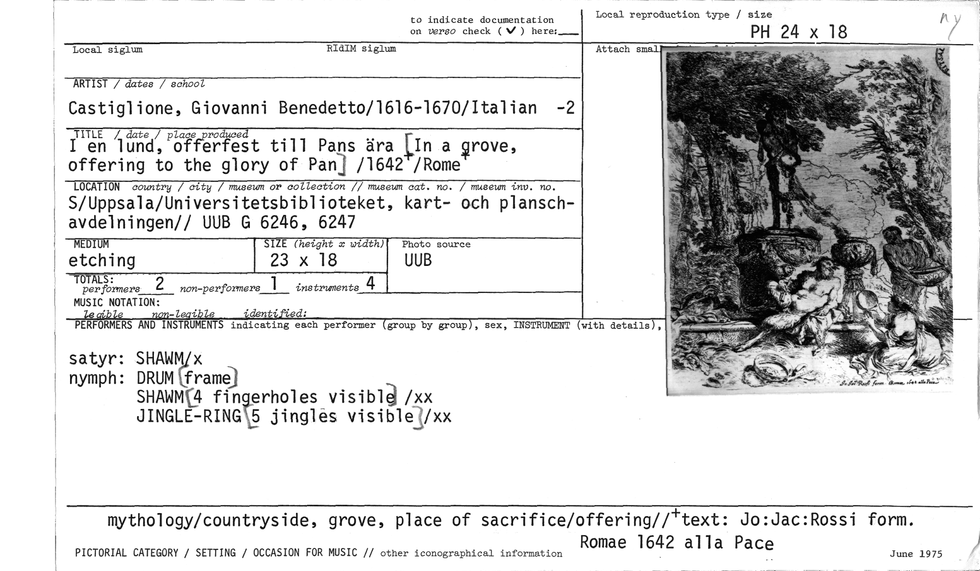 //// to indicate documentation //// on verso check (V ) here:_ //// Local reproduction type / size //// PH 24 x 18 //// Local siglum //// Attack small //// RIdIM siglum //// ARTIST / dates / school //// Castiglione, Giovanni Benedetto/1616-1670/Italian - //// TITLE / date / place_prodtsced //// I en lund, offerfest till Pans ära In a grove, offering to the glory of Pan /1642 /Rome //// LOCATION country / city / museum or collection // museum cat. no. / museum inv. no. //// S/Uppsala/Universitetsbiblioteket, kart- och planschavdelningen// UUB G 6246, 6247 //// MEDIUM SIZE (height x width) Photo source //// etching 23 x 18 UUB //// TÖTALS: //// per formers 2 non-performers 1 instruments 4 //// MUSIC NOTATION: //// leuible non-leaible identified: //// PERFORMERS AND INSTRUMENTS indicating each performer (group by //// group), sex, INSTRUMENT (with details), //// satyr: SHAWM/x //// nymph: DRUMframe] //// SHAWMO fingerholes visibla /xx JINGLE-RINGU jingles visiblejxx //// 21,4,q4d, //// PICTORIAL CATEGORY / SETTING / OCCASION FOR MUSIC // other iconographical information //// mythology/countryside, grove, place of sacrifice/offering//+text: Jo:Jac:Rossi form. //// Romae 1642 alla Pace //// June 1975 ////