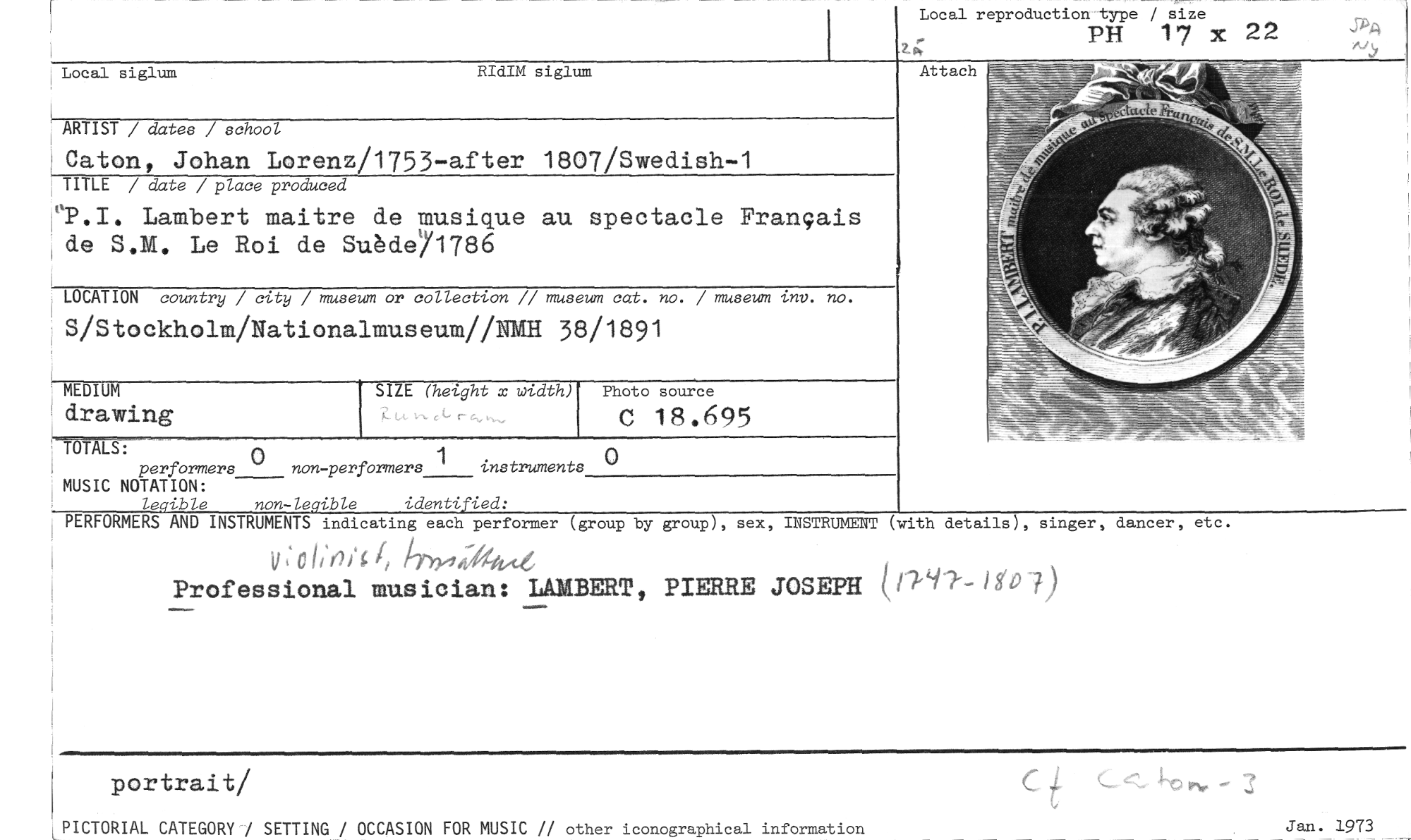 //// Local reproduction type / size //// PH 17 x 22 //// Attach //// Local siglum RIdIM siglum //// ARTIST / dates / school //// Caton, Johan Lorenz/1753-after 1807/Swedish-1 //// TITLE / date / place produced //// 'F.I. Lambert maitre de musique au spectacle Fran9ais de S.M. Le Roi de Subde71786 //// LOCATION country / city / museum or collection // museum cat. no. / museum inv. no. //// S/Stockholm/NationalmuseumIINME 38/1891 //// SIZE (height x width) //// MEDIUM //// drawing //// Photo source //// C 18.695 //// TOTALS: //// performers non-performers instruments //// MUSIC NOTATION: //// legible non-legible identified: //// PERFORMERS AND INSTRUMENTS indicating each performer (group by group), sex, INSTRUMENT (with details), singer, dancer, etc. //// Aryy,444„‹.4 //// Professional musician: LAMBERT, PIERRE JOSEPH (ng-Y-407) //// portrait/ C t - //// //// //// PICTORIAL CATEGORY 1 SETTING / OCCASION FOR MUSIC // other iconographical information //// Jan. 1973 ////