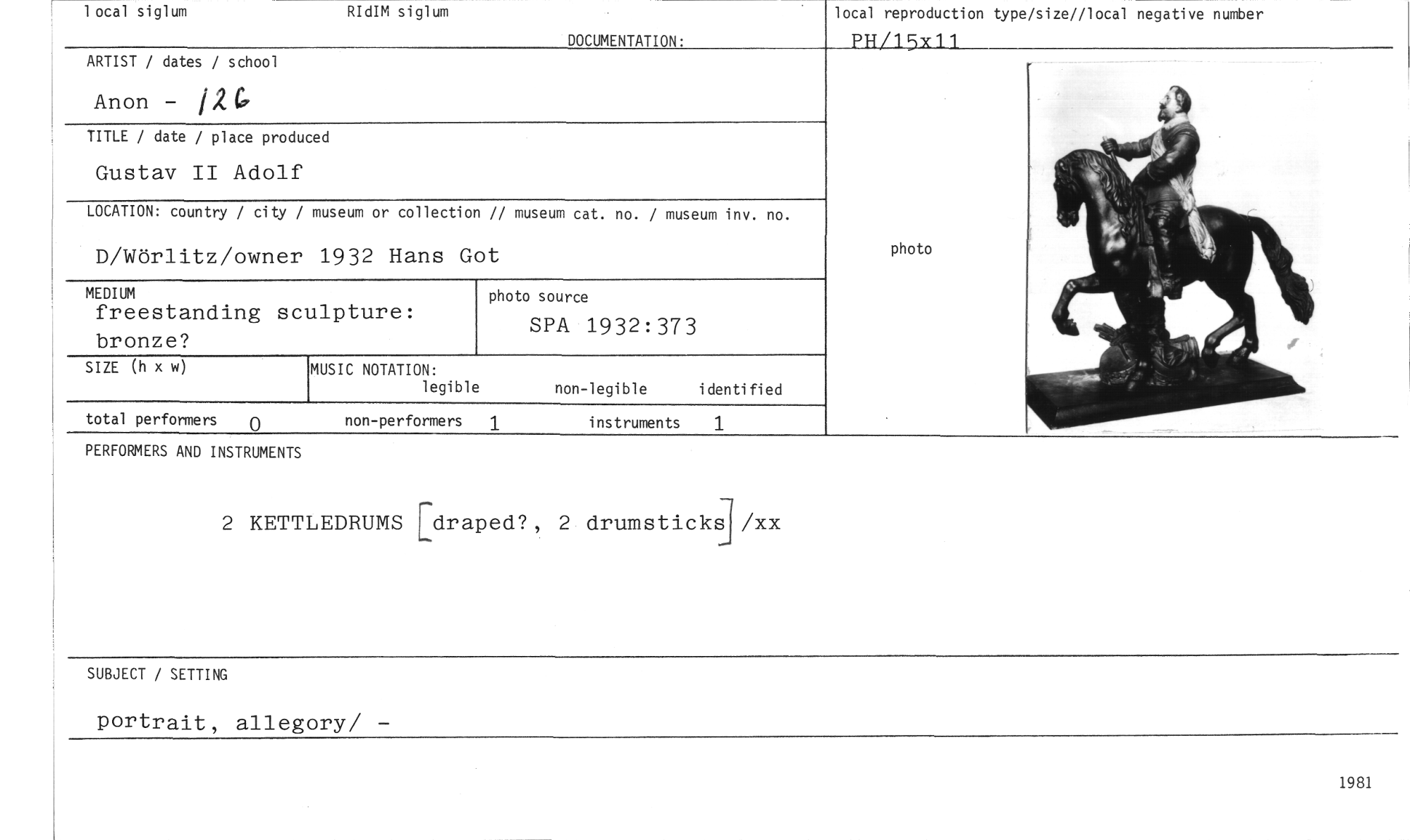 //// 1 ocal siglum //// RIdIM siglum //// DOCUMENTATION: //// local reproduction type/size//local negative number //// PH/15x11 //// ARTIST / dates / school //// Anon - 12 6 //// TITLE / date / place produced //// Gustav II Adolf //// LOCATION: country / city / museum or collection // museum cat. no. / museum inv. no. //// D/Wörlitz/owner 1932 Hans Got //// MEDIUM //// freestanding sculpture: bronze? //// MUSIC NOTATION: //// legible non-legible identified //// total performers o non-performers 1 instruments 1 //// SIZE (h x w) //// photo source //// SPA 1932:373 //// photo //// PERFORMERS AND INSTRUMENTS //// 2 KETTLEDRUMS rdraped?, 2 drumstickSj/xx //// SUBJECT / SETTING //// portrait, allegory/ - //// 1981 ////