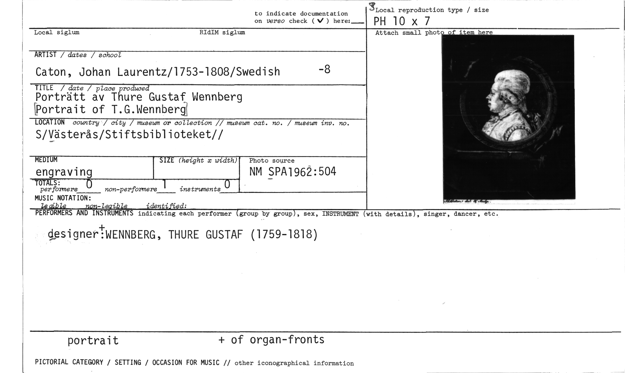 //// !Local reproduction type / size //// PH 10 x 7 //// Local siglum RIdIM siglum //// Attach small phot //// ARTIST / dates / school //// Caton, Johan Laurentz/1753-1808/Swedish //// -8 //// TITLE / date / placeproduced //// Porträtt av Thure Gustaf Wennberg [Portrait of T.G.Wennbergl //// LOCATION country" city / museum or collection // museum cat. no. / museum inv. no. //// S/Västerås/Stiftsbiblioteket// //// MEDIUM //// engraving //// SIZE (height x width) //// Photo source //// NM SPA1962:504 //// per formera non-performers //// MUSIC NOTATION: //// letible non-leaible identified: //// PERFORMERS AND INSTRUMENTS //// ---ö-- //// instruments //// indicating each performer (group by group), sex, //// INSTRUMENT (with details), singer, dancer, etc. //// designerIWENNBERG, THURE GUSTAF (1759-1818) //// portrait + of organ-fronts //// PICTORIAL CATEGORY / SETTING / OCCASION FOR MUSIC // other iconographical information //// to indicate documentation on verso check (N/ ) here: ////