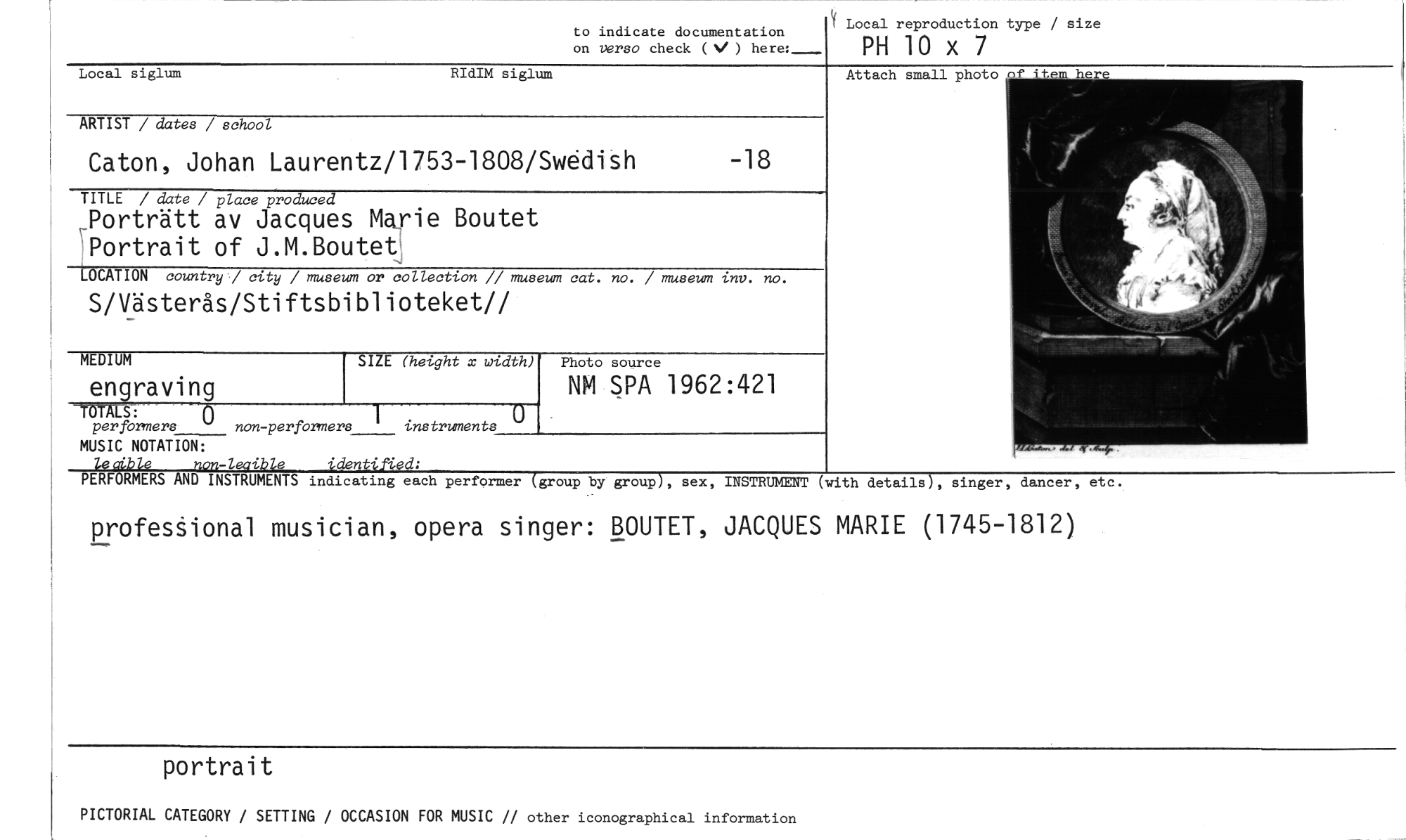 //// to indicate documentation //// on verso check ( V ) here:_ //// Local reproduction type / size //// PH 10 x 7 //// Local siglum RIdIM siglum //// ARTIST / dates / school //// Caton, Johan Laurentz/1753-1808/SAdish -18 //// TITLE / date / place produced //// Porträtt av Jacques Marie Boutet Portrait of J.M.Boutet //// LOCATION country / city / museum or collection // museum cat. no. / museum tnv. no. //// S/Västerås/Stiftsbiblioteket// //// MEDIUM //// engraving //// Attach small photo of //// SIZE (height x width) //// Te 'LS: //// perfbrmers non-perfbrmers instruments //// MUSIC NOTATION: //// lecible non-leaible identi.-ffed; //// Photo source //// NM SPA 1962:421 //// PERFORMERS AND INSTRUMENTS indicating each performer Cgroup by group), sex, INSTRUMENT (with details), singer, dancer, etc. //// profes§ional musician, opera singer: BOUTET, JACQUES MARIE (1745-1812) //// portrait //// PICTORIAL CATEGORY / SETTING / OCCASION FOR MUSIC // other iconographical information ////