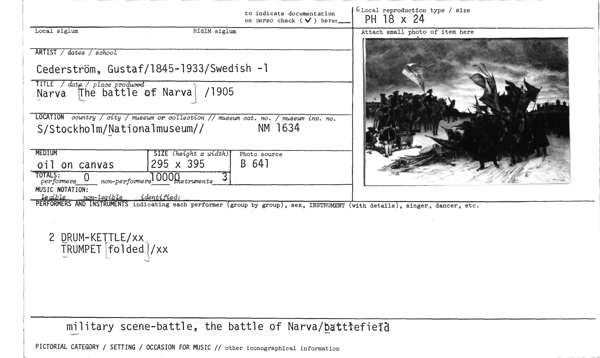 //// to indicate documentation //// on verso check ( ) here:_ //// CLocal reproduction type / size //// PH 18 x 24 //// Local siglum RIdIM siglum //// Attach //// ARTIST / dates / school //// Cederström, Gustaf/1845-1933/Swedish -1 //// TITLE / dat / place produced //// Narva The battle of Narva] /1905 //// LOCATION country / city / museum or collection // museum cat. no. / museum tuo. no. //// S/Stockholm/Nationalmuseum// NM 1634 //// MEDIUM //// SIZE (height x width) //// oil on canvas //// Photo source //// B 641 //// 295 x 395 //// per formers s." non-performers10001truments //// MUSIC NOTATION: //// / i •e //// PERFORMERS AND INSTRUMEN S indicating each performer group by group , sex, INSTRUMENT (with details), singer, dance , etc. //// 2 DRUM-KETTLE/xx TRUMPET'foldedyxx //// military scene-battle, the battle of Narva/batttefien //// PICTORIAL CATEGORY / SETTING / OCCASION FOR MUSIC // other iconographical information ////