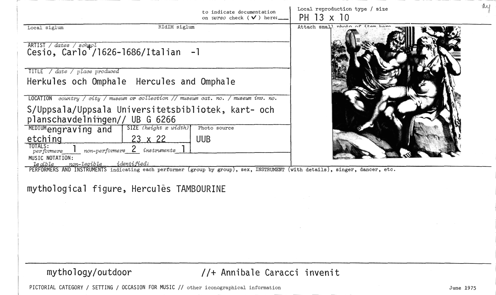 //// to indicate documentation Local reproduction type / size //// on verso check (V ) here: PH 13 x 10 //// Attach smal //// Local siglum RIdIM siglum //// ARTIST / dates / sch.pl //// Cesio, Carlo /1626-1686/Italian -1 //// TITLE / date / place produced //// Herkules och Omphale Hercules and Omphale //// LOCATION country / city / museum or collection // museum cat. no. / museum inv. no. //// S/Uppsala/Uppsala Universitetsbibliotek, kart- och //// planschavdelnitigen// UB G 6266 //// m°"mengraving and SIZE (height x width) Photo source //// etching 23 x 22 UUB //// TOTALS: //// per formers 1 non-performers 2 instruments 1 //// MUSIC NOTATION: //// Zeoible non-legihle identified; //// PERFORMERS AND INSTRUMENTS //// mythological figure, Herculs TAMBOURINE //// låd^ //// sex, INSTRUMENT (with details), singer, dancer, etc. //// indicating each performer (group by group), //// mythology/outdoor /1-1- Annibale Caracci invenit //// PICTORIAL CATEGORY / SETTING / OCCASION FOR MUSIC // other iconographical information //// June 1975 ////