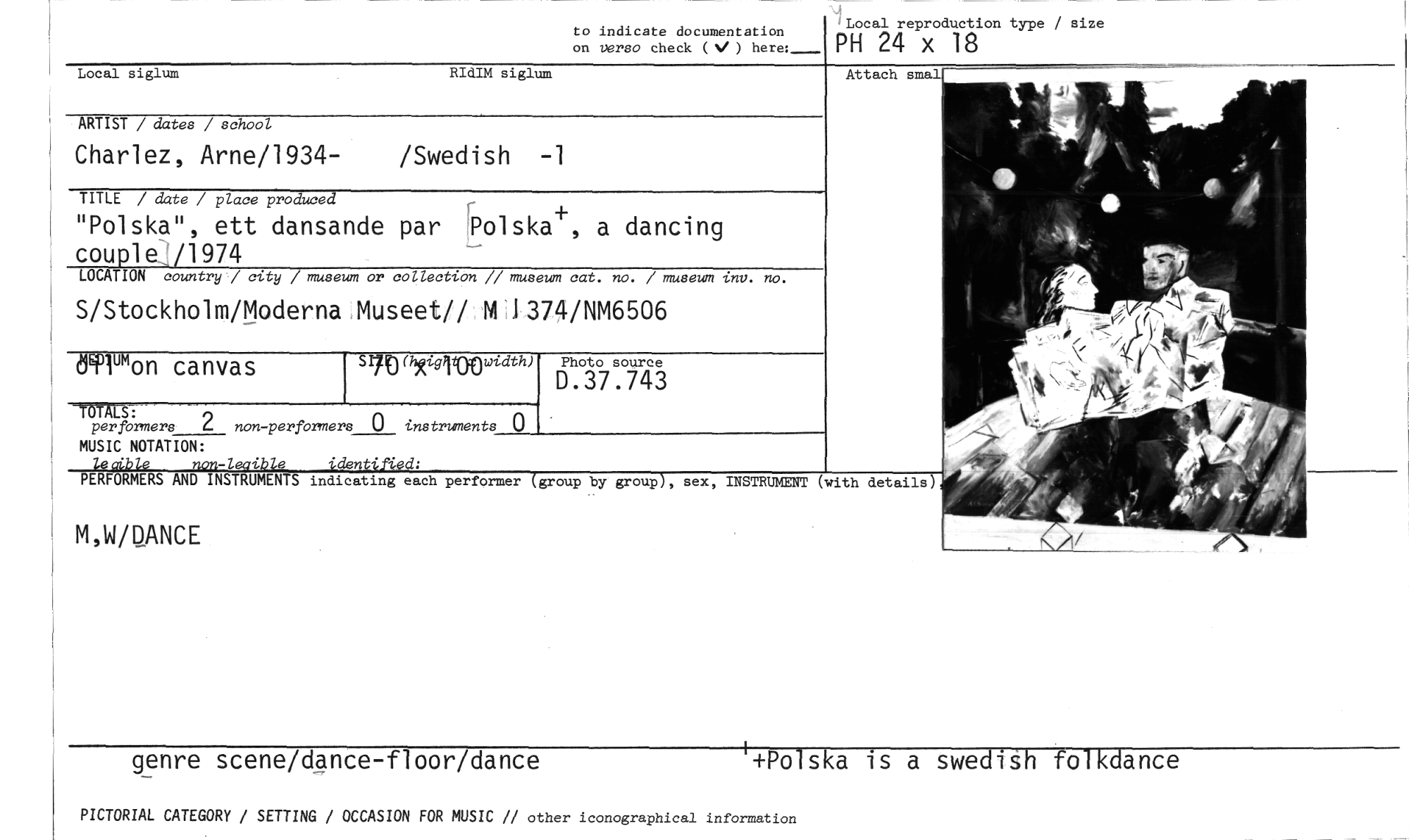 //// to indicate documentation //// on versa check ( ) here: //// Local reproduction type / size //// PH 24 x 18 //// Local siglum RIdIM siglum //// Attach smal //// ARTIST / dates / school //// Charlez, Arne/1934- /Swedish -1 //// TITLE / date / place produced //// "Polska" ett dansande par Polska+, a dancing couplej1974 //// LOCATION country / city / museum or collection // museum cat. no. / museum inv. no. //// S/Stockholm/Moderna.Museet// M 1374/NM6506 //// ffiumon canvas //// 110NigTOwidth) //// önY:74å //// per formers 2 non-perforners 0 instruments 0 //// MUSIC NOTATION: //// Zealble non-leaible identified: //// PERFORMERS AND INSTRUMENTS indicating each performer //// M,W/DANCE //// (group by group), sex, INSTRUMENT (with details) //// genre scene/dance-floor/dance '+Polska is a swedi01 folkdance //// PICTORIAL CATEGORY / SETTING / OCCASION FOR MUSIC // other iconographical information ////