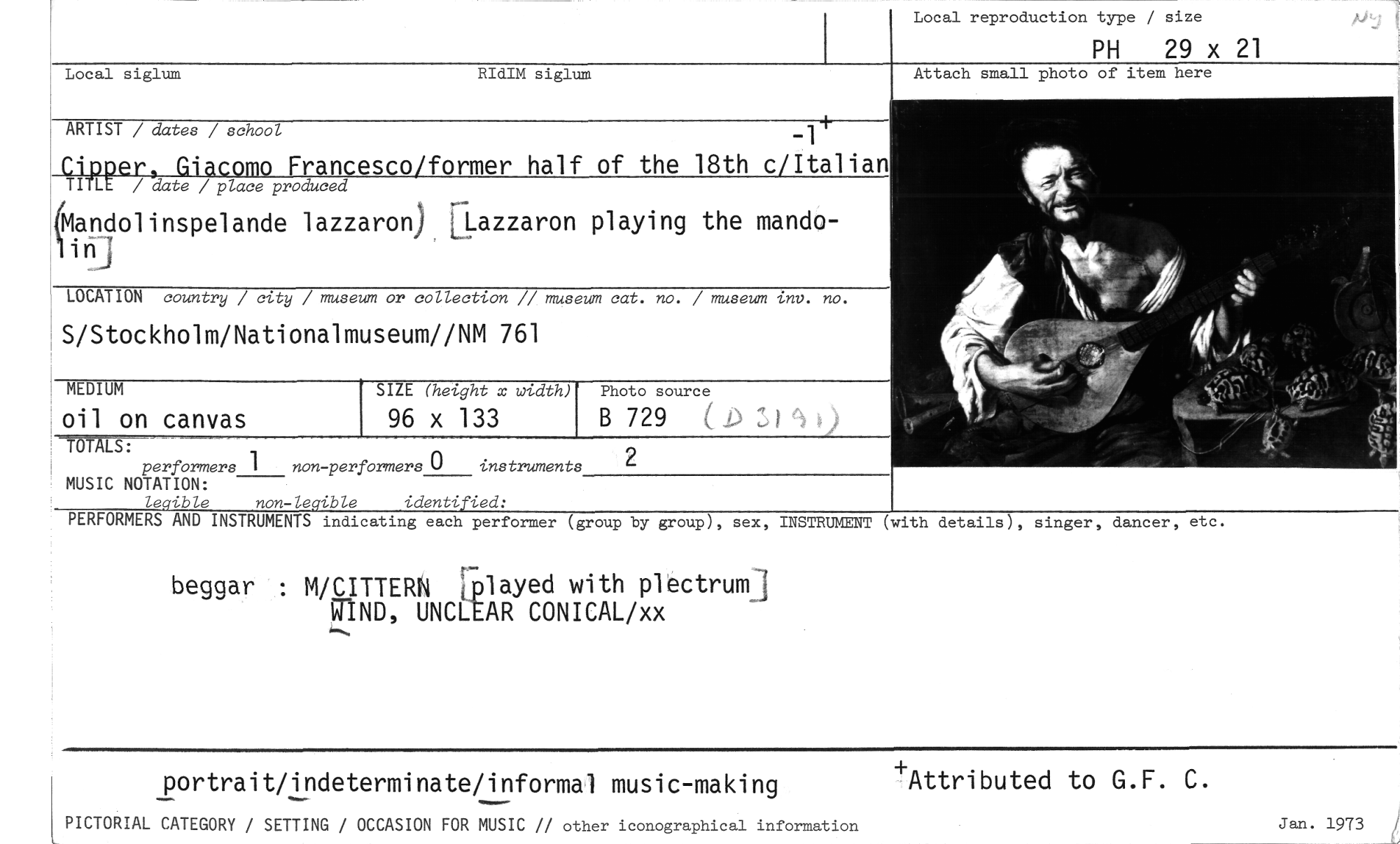 //// Local reproduction type / size //// PH 29 x 21 //// Local siglum RIdIM siglum Attach small photo of item here //// ARTIST / dates / school -1 //// Cuper, Giacomo Francescojformer half of the 18th c/Italian //// TITLE / date / place produced 41 o'011 //// (Mandolinspelande lazzaron) [Lazzaron playing the mandoihl ^ //// LOCATION country / city / museum or collection // museum cat. no. / museum inv. no. //// t i 4 //// S/Stockholm/Nationalmuseum//NM 761 i //// 11111111-1'^ //// MEDIUM SIZE (height x width) Photo source ; , 4 , //// oil on canvas 96 x 133 B 729 ( Z.)n h) ,, //// TOTALS : //// parformers 1 non-performers 0 instruments //// --- -- -• //// //// legible non-legible identified: //// PERFORMERS AND INSTRUMENTS indicating each performer (group by group), sex, INSTRUMENT (with details), singer, dancer, etc. //// beggar : M/CITTERN [Played with plectruml WIND, UNCLEAR CONICAL/xx //// portrait/indeterminate/informal music-making //// +Attributed to G.F. C. //// PICTORIAL CATEGORY / SETTING / OCCASION FOR MUSIC // other iconographical information Jan. 1973 ////