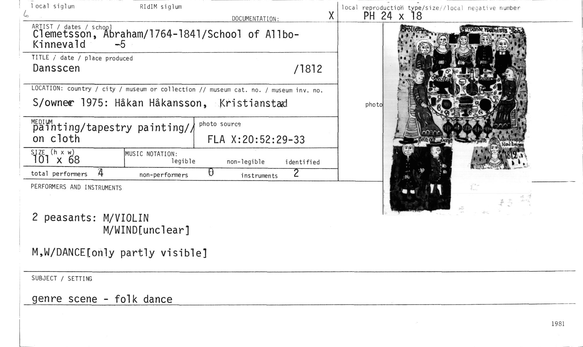//// 1 ocal siglum //// RIdIM siglum //// lotal reproductiori type/size//lotal negative nunter //// PH 24 x 18 //// DOCUMENTATION' //// ARTIST / dates / sch0.01 //// Clemetsson, Abraham/1764-1841/School of AllboKinnevald —5 //// TITLE / date / place produced //// Dansscen //// /1812 //// LOCATION: country / city / museum or collection // museum cat. no. / museum inv. no. //// S/ownee 1975: Håkan Håkansson, Kristianstad //// photo //// photo source //// FLA X:20:52:29-33 //// MEDIUM . //// painting/tapestry painting/i on cloth //// MUSIC NOTATION: //// legible //// non-legible identified //// instruments //// SIZE (h x w) //// 101 x 68 //// total performers 4 //// non-performers //// PERFORMERS AND INSTRUMENTS //// 2 peasants: M/VIOLIN //// M/WIND[unclearl //// M,W/DANCE[only partly visible] //// SUBJECT / SETTING //// genre scene - folk dance //// 1981 ////