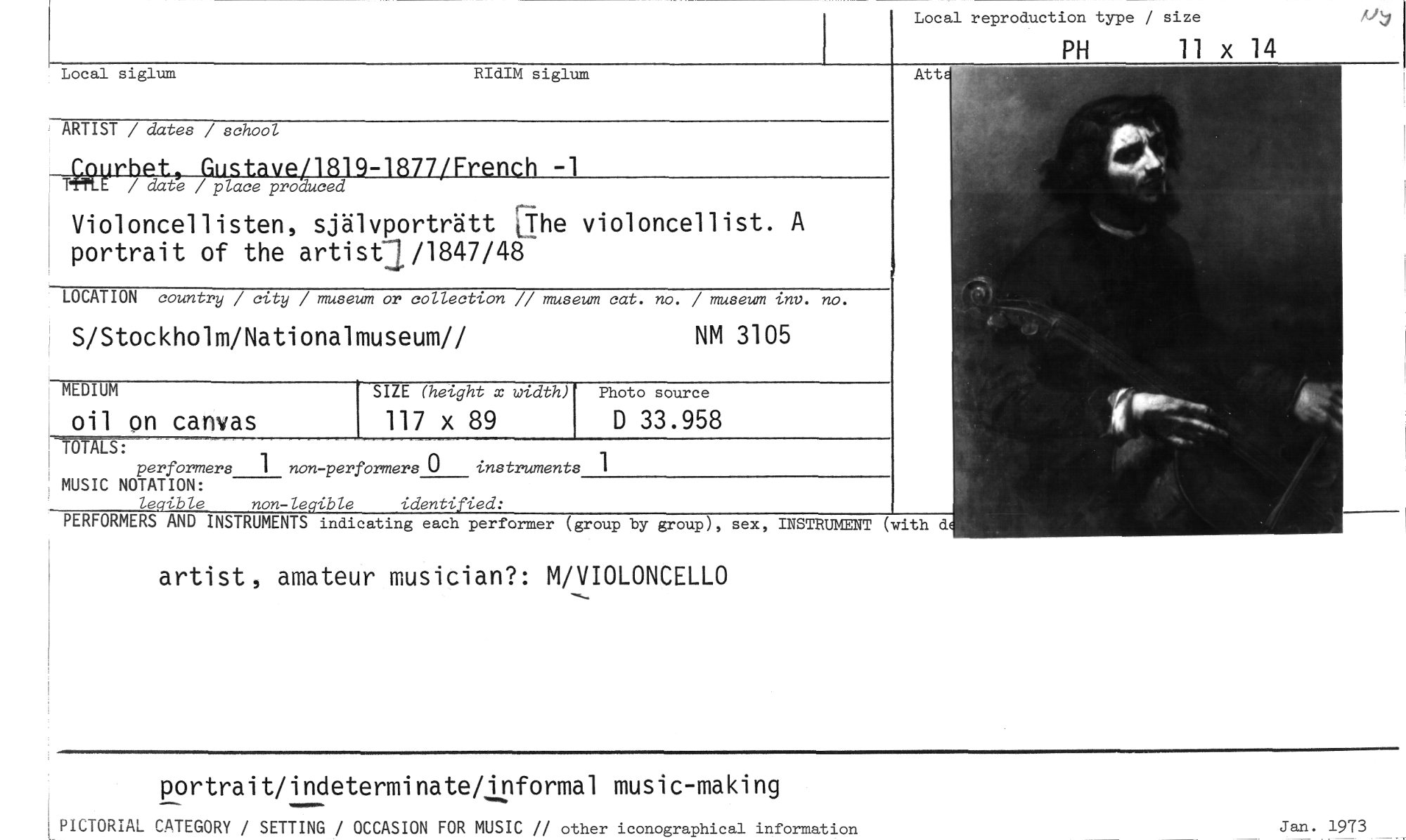 //// portrait/indeterminate/nformal music-making //// PICTORIAL CATEGORY / SETTING / OCCASION FOR MUSIC // other iconographical information Jan. 1973 //// S/Stockholm/Nationalmuseum// //// NM 3105 //// Local reproduction type / size //// PH 11 x 14 //// Local siglum RIdIM siglum //// ARTIST / dates / school //// AprhpdbM1/219-1877/French -1 //// Violoncellisten, självporträtt [the violoncellist. A portrait of the artist3/1847/48- //// LOCATION country / city / museum or collection // museum cat. no. / museum inv. no. //// TOTALS: //// performers 1 non-performers 0 instruments 1 //// MUSIC NOTATION: //// le ible non-le ible identi ied: //// PERFORMERS AND INSTRUMENTS indicating each performer (group by group), sex, //// artist, amateur musician?: M/VIOLONCELLO //// INSTRUMENT (with d //// MEDIUM //// oil on canvas //// SIZE (height x width) //// 117 x 89 //// Photo source //// D 33.958 ////