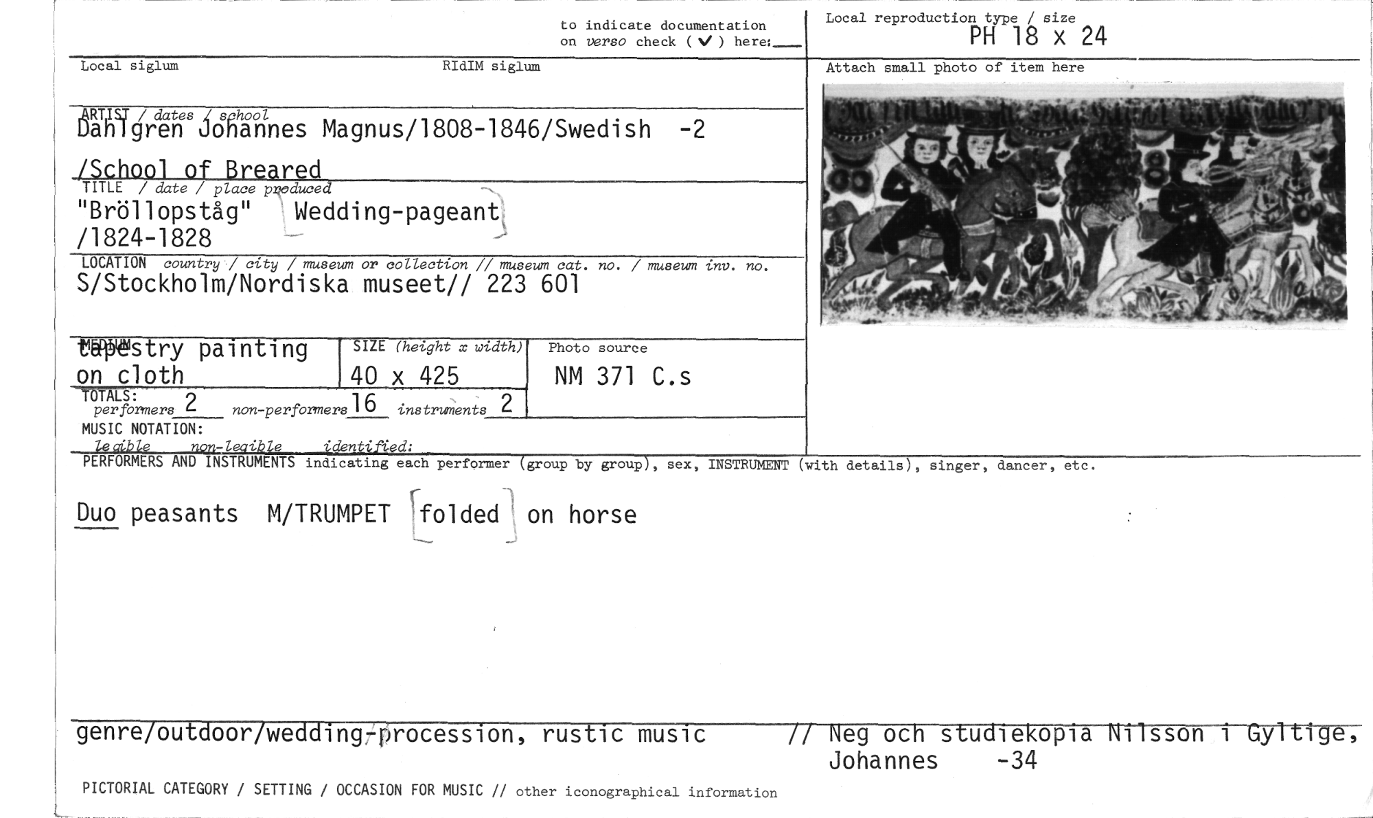 //// to indicate documentation on versa check (N/ ) here: //// Local reproduction type / size //// PH 18 x 24 //// Local siglum RIdIM siglum Attach small photo of item here //// //// ARTIST / dates school //// Dahlgren Johannes Magnus/1808-1846/Swedish -2 //// /School of Breared //// TITLE / date / place pnoduced //// "Bröllopståg" Wedding-pageant //// /1824-1828 //// LOCATION country / city / museum or collection // museum cat. no. / museum inv. no. //// S/Stockholm/Nordiska museet// 223 601 //// VäMstry painting SIZE (height x width) //// on cloth 40 x 425 //// Photo source //// NM 371 C.s //// -TOTALS: 2 per formers c.- non-performers16 instruments 2 //// MUSIC NOTATION: //// -/ * e "de d: //// PERFORMERS AND INSTRUMENTS indicating each performer //// group by group , sex, INSTRUMENT (with details), singer, danser, etc. //// Duo peasants M/TRUMPET 'folded on horse //// genre/outdoor/wedding-procession, rustic music // Neg och studiekopia Nilsson i byltige, //// Johannes -34 //// PICTORIAL CATEGORY / SETTING / OCCASION FOR MUSIC // other iconographical information ////