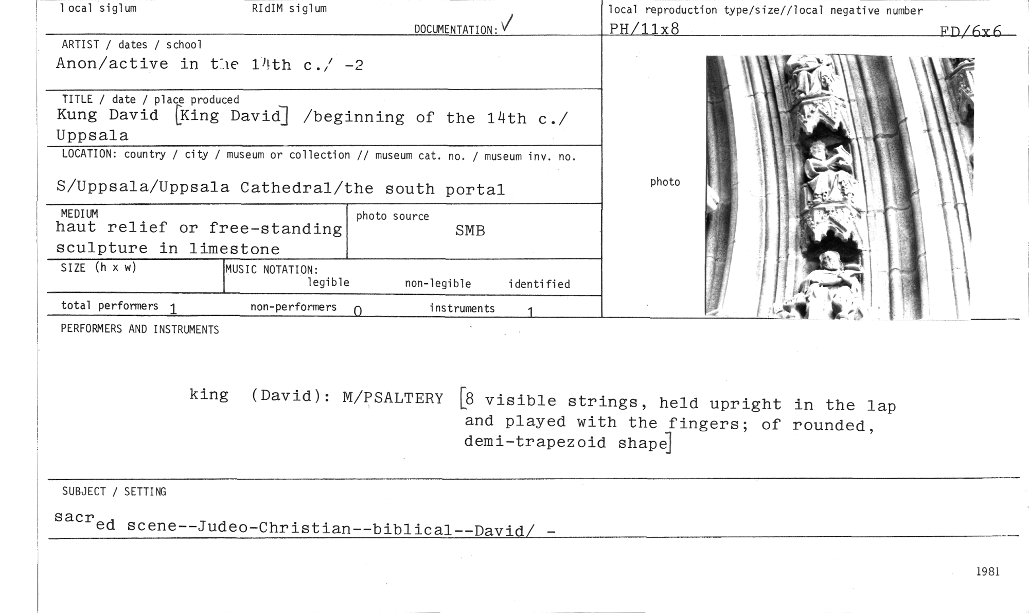 //// king (David): M/PSALTERY [8 visible strings, held upright in the lap and played with the fingers; of rounded, demi-trapezoid shape] //// SUBJECT / SETTING //// sacred scene--Judeo-Christian--biblical--David/ - //// RIdIM siglum //// 1 ocal siglum //// DOCUMENTATION: //// lotal reproduction type/size//local negative number //// PH/11x8 FD/rix.6._ //// ARTIST / dates / school //// Anon/active in tTle 14th c./ -2 //// TITLE / date / place produced //// Kung David [King David] /beginning of the 14th c./ Uppsala //// LOCATION: country / city / museum or collection // museum cat. no. / museum inv. no. //// S/Uppsala/Uppsala Cathedral/the south portal //// MEDIUM //// haut relief or free-standing scuipture in limestone //// photo //// MUSIC NOTATION: //// legible //// non-legible identified //// total performers 1 //// PERFORMERS AND INSTRUMENTS //// non-performers 0 instruments //// photo source //// SMB //// 1 //// 1981 ////
