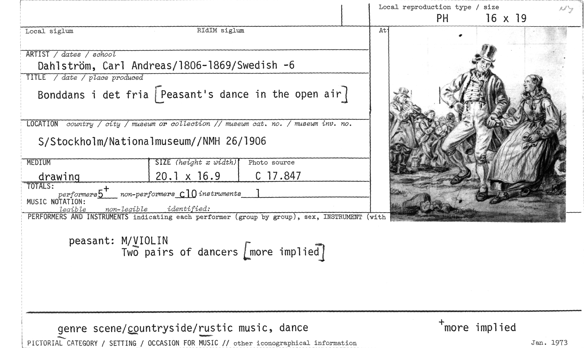 //// Local reproduction type / size //// PH 16 x 19 //// Local siglum RIdIM siglum //// ARTIST / dates / school //// Dahlström, Carl Andreas/1806-1869/Swedish -6 //// TITLE / date / place produced //// Bonddans i det fria Ifeasant's dance in the open air] //// LOCATION country / city / museum or collection // museum cat. no. / museum inv. no. //// S/Stockholm/Nationalmuseum//NMH 26/1906 //// Photo source //// SIZE (height x width) //// 20.1 x 16.9 //// drawinq C 17.847 //// MEDIUM //// TWALS: //// perforriers5+ //// MUSIC NOTATION: //// Le ible non-le ible identi ied: //// PERFORMERS AND INSTRUMENTS indicating each performer (group by group), sex, INSTRUMENT (with //// 1 //// non-performers C 1 0 instruments //// peasant: M/VIOLIN //// Two pairs of dancers Emore implied] //// genre scene/countryside/rustic music, dance //// PICTORIAL CATEGORY / SETTING / OCCASION FOR MUSIC // other iconographical information //// +more implied //// Jan. 1973 ////