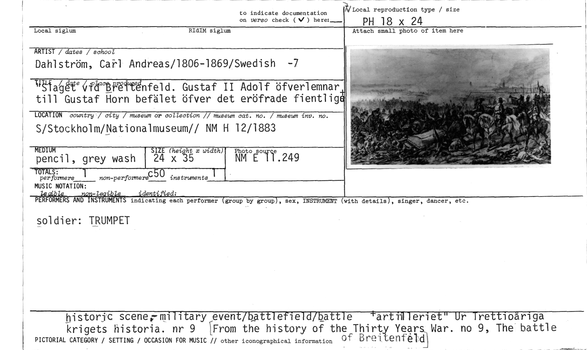 //// to indicate documentation //// on verso check (%, ) here:_ //// kLocal reproduction type / size //// PH 18 x 24 //// Attach small photo of item here //// (with details), singer, dancer, etc. //// soldier: TRUMPET //// historic scener military eventaattlefieldaattie *artilleriet" Ur Trettioåriga //// krigets historia. nr 9 tFrom the history of the Thirty Year. War. no 9, The battle //// PICTORIAL CATEGORY / SETTING / OCCASION FOR MUSIC // other iconographical information of Breitenfgd //// LOCATION country ./ city / museum or collection // museum cat. no. / museum tnv. no. //// S/Stockholm/Nationalmuseum// NM H 12/1883 //// RWTTY.249 //// MEDIUM SIZE (hej ht x width) //// pencil, grey wash 24 x 35 //// //// per formers non -performersC0 instruments 1 //// 1 //// MUSIC NOTATION: //// lealble non-leaible _identified: //// PERFORMERS AND INSTRUMENTS indicating each performer (group by group), sex, INSTRUMENT //// TOTAS: //// ARTIST / dates / school //// Dahlström, Ca-r1 Andreas/1806-1869/Swedish -7 //// nia6etefetlflätt4nfeld. Gustaf II Adolf öfverlemnar, till Gustaf Horn befälet öfver det eröfrade fientligd //// Local siglum RIdIM siglum ////