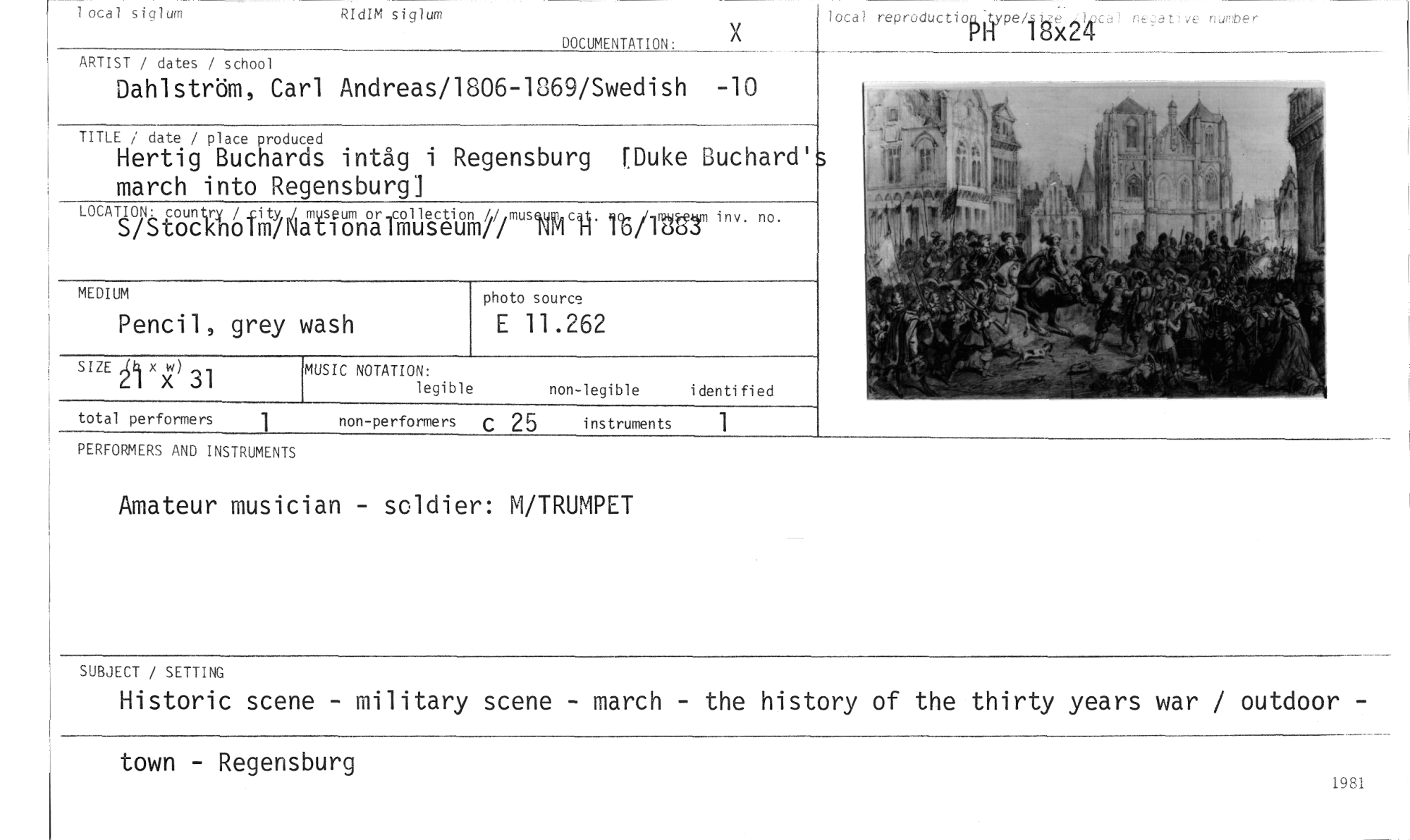 //// x //// ocal siglum //// RId M siglum //// local reproductio //// Pe 18x24 //// ve svnber //// DOCUMENTATION: //// ARTIST / dates / school //// Dahlström, Carl Andreas/1806-1869/Swedish -10 //// TITLE / date / place produced //// Hertig Buchards intåg i Regensburg (Duke Buchard' march into Regensburg] //// MEDIUM photo source //// Pencil, grey wash E 11.262 //// w) 31 MUSIC NOTATION: non-legible i denti fied //// SIZE 21 x x legible //// total performers 1 non-performers c 25 instruments 1 //// PERFORMERS AND INSTRUMENTS //// Amateur musician - scldier: M/TRUMPET //// LOCATION: countrX / ity å amtsfujnuicipfilliesvävämullmcfi. ntirpät)g3m inv. no. //// S/Stocknoim/ //// SUBJECT / SETTING //// Historic scene - military scene - march - the history of the thirty years war / outdoor - //// town - Regensburg //// 1981 ////