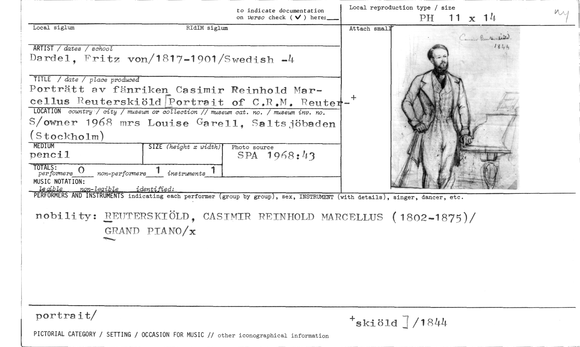 //// to indicate documentation //// on verso check ( ) heres___. //// Local reproduction type / size //// PH 11 x 14 //// Local siglum RIdIM siglum //// Attach smal] //// ARTIST / datea / school //// Dardel, Fritz von/1817-1901/Swedish -4 //// TITLE / date / place produced //// Porträtt av fänriken Casimir Reinhold Mar-cellus Reuterskiöldfrortrait of C.R.M. Reuter-4- //// LOCATION country,/ city / museum or collection // museum cat. no. / museum inv. no. //// S/owner 1968 mrs Louise Garell, Saltsjöbaden (Stockholm) //// MEDIUM //// pencil //// -TUTATS: //// performers () non-performers instruments //// MUSIC NOTATION: //// nnn-leaible identified: //// PERFORMERS AND INSTRUMENTS indicating each performer (group by group-Y, sex, //// nobility: REUTERSKIÖLD, CASIMIR REINHOLD MARCELLUS (1802-1875)/ GRAND PIANO/x //// portrait/ +skind , • /- 1844 //// PICTORIAL CATEGORY / SETTING / OCCASION FOR MUSIC // other iconographical information //// SIZE (height x width) //// Photo source //// SPÅ 1968:43 //// INSTRUMENT (with details), singer, dancer, etc. ////