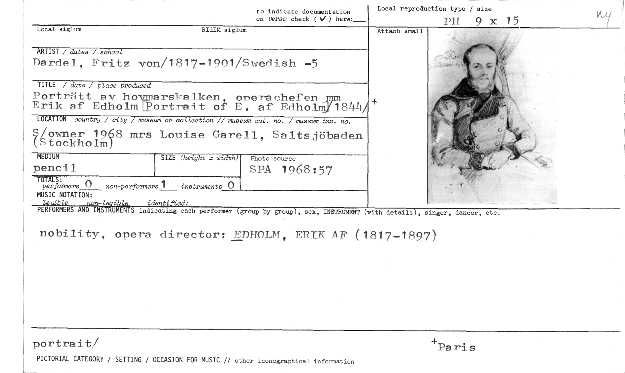 //// to indicate documentation //// on vers° check (V) here:_ //// Local reproduction type / size //// PH 9 x //// Attach small //// Local siglum RIdIM siglum //// ARTIST / dates / school //// Dardel, Fritz von/1817-1901/Swedish -5 //// TITLE / date / place produced //// Porträtt av howarskelken operachefen_m Erik af Edholm Portrait of E. af Edholm/184V //// LOCATION country / city / museum or collection // museum cat. no. / museum inv. no. //// (Stockholm) //// 1968 mrs Louise Garell, Saltsjöbaden (Stockholm) //// SIZE (height x oidth) //// TOTALS: //// perfbrmers () non -perfOrmers 1 instruments () //// MUSIC NOTATION: //// 7.4422/e non-lecible identified; //// PERFORMERS AND INSTRUMENTS indicating each performer (group by group), sex, INSTRUMENT (with details), singer, dancer, etc. //// nobility, opera director: EDHOLM, ERIK AF (1817-1897) //// MEDIUM //// pencil //// Photo source //// SPA 1968:57 //// T)ortrai_t/ //// PICTORIAL CATEGORY / SETTING / OCCASION FOR MUSIC // other iconographical information //// +Paris ////