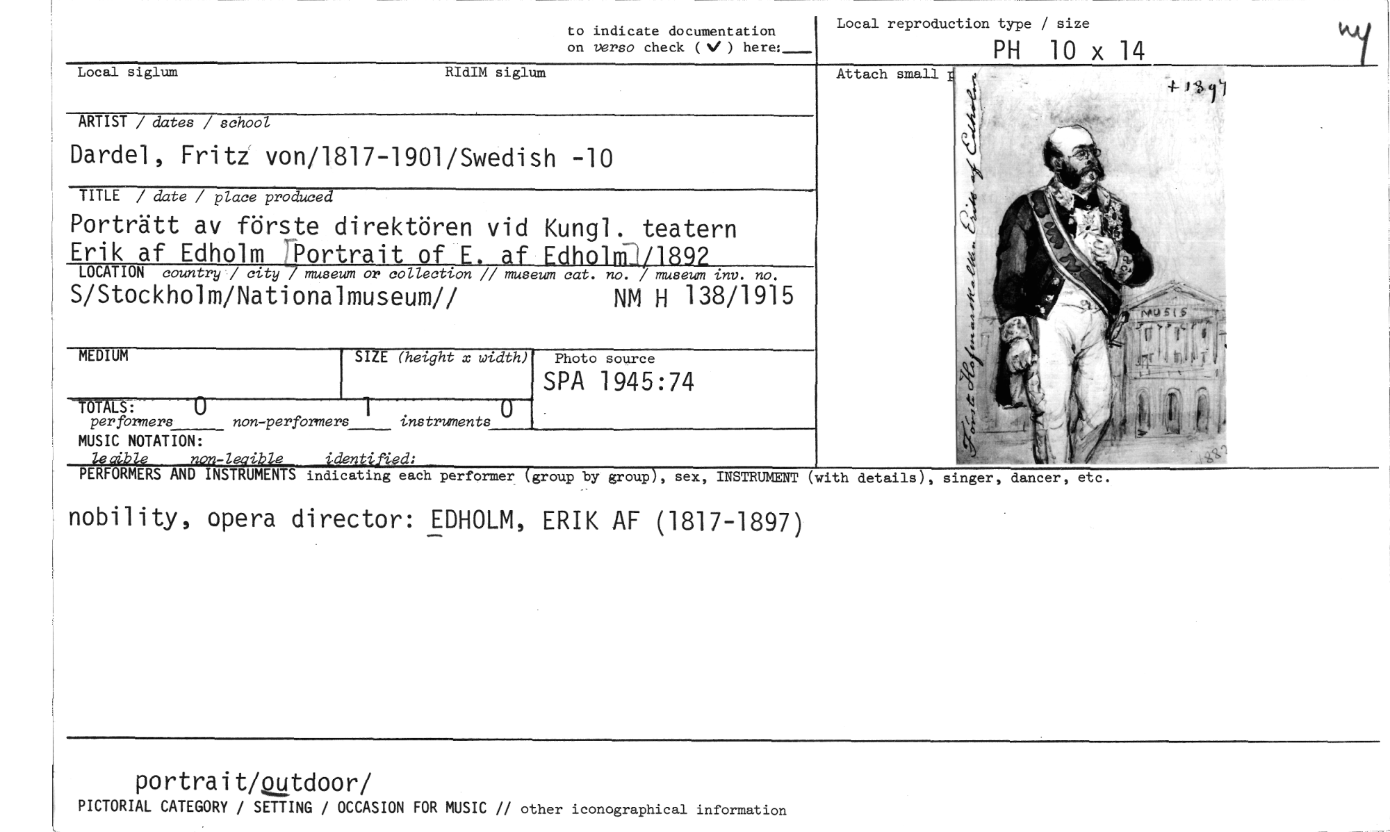 //// to indicate documentation //// on versa check (V ) here:_ //// Local reproduction type / size //// PH 10 x 14 //// Local siglum RIdIM siglum //// Attach small //// ARTIST / dates / school //// Dardel, Fritz von/1817-1901/Swedish -10 //// TITLE / date / place produced //// Porträtt av förste direktören vid Kungl. teatern //// Erik af Edholm TPortrait o //// LOCATION country / city museum or collection // museum //// S/Stockholm/Nationalmuseum// //// / museum 7.nv. no. //// NM H 138/1915 //// MEDIUM //// SIZE (height x bn.dth) //// SPA 1945:74 //// Irrrr3T-M performers non-performere instruments //// MUSIC NOTATION: //// lecible non-lecible identified: //// PERFORMERS AND INSTRUMENTS indicating each performer (group by group), sex, INSTRUMENT (with details), singer, dancer, etc. //// nobility, opera director: EDHOLM, ERIK AF (1817-1897) //// portrait/outdoor/ //// PICTORIAL CATEGORY / SETTING / OCCASION FOR MUSIC // other iconographical information ////