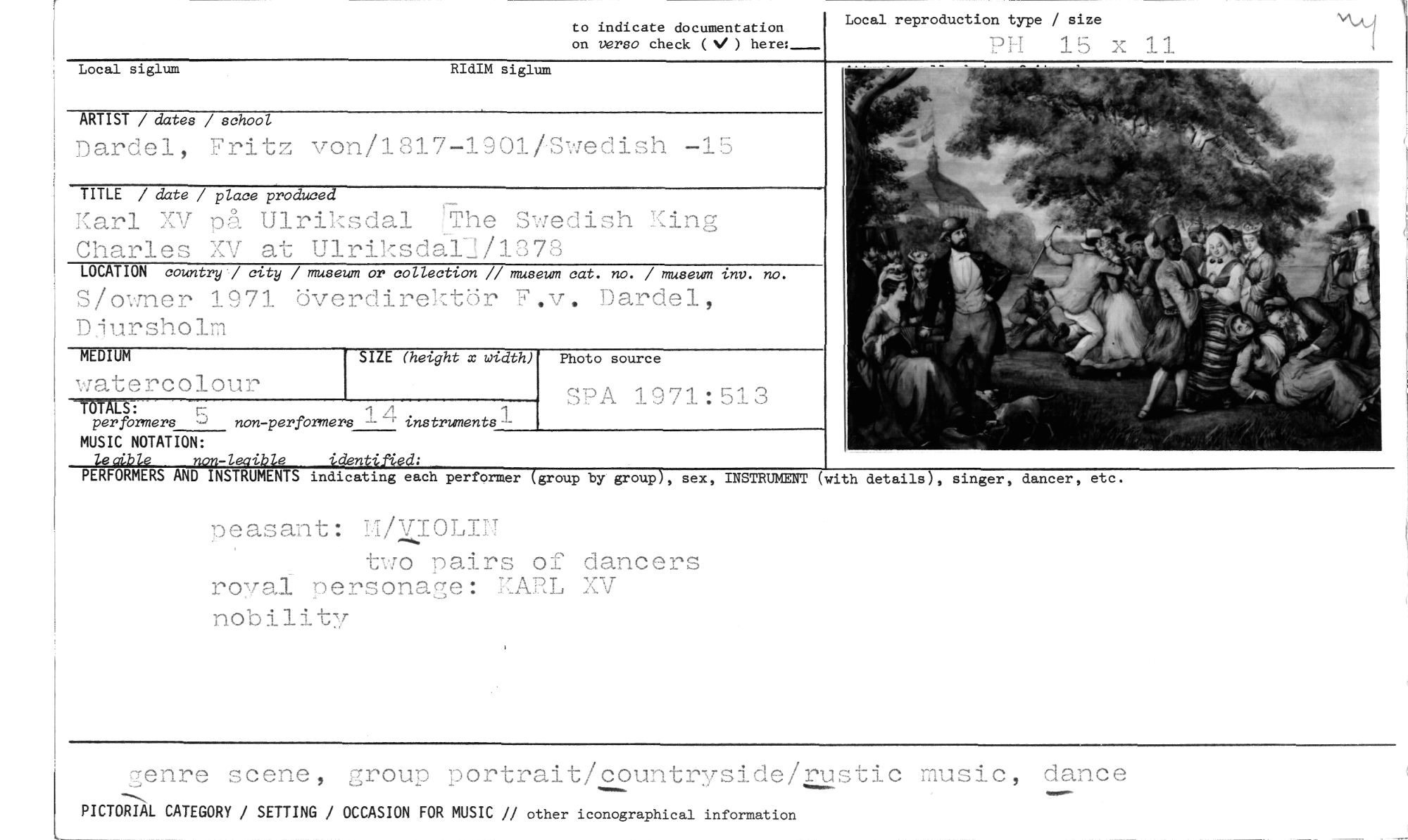 //// Local reproduction type / size //// PH 15 x 11 //// to indicate documentation on versa check ( V) //// Local siglum RIdIM siglum //// ARTIST / dates / school //// Dardel, Fritz von/1817-1901/S•edish -15 //// TITLE / date / place produced //// Karl XV på Ulriksdal ghe Swedish King Charles XV at Ulriksdal-j/1378 //// LOCATION country '/ city / museum or collection // museum cat. no. / museum inv. no. //// S/m,,ner 1971 överdirektdr F.v. Dardel, Djursholm //// SIZE (height x width) //// roTALS: //// per formers J non-perfbrmers 14 instruments //// MUSIC NOTATION: //// leaible non-leaibie identified: //// PERFORMERS AND INSTRUMENTS indicating each performer (group by group), sex, INSTRUMENT (with details), singer, dancer, etc. //// peasant: //// two pairs of dancers roval personage: KARL XV //// nobility //// genre scene, group portrait/countryside/rustic music, dance //// PICTORIAL CATEGORY / SETTING / OCCASION FOR MUSIC // other iconographical information //// MEDIUM //// watercolour //// Photo source //// SPA 1971:513 ////
