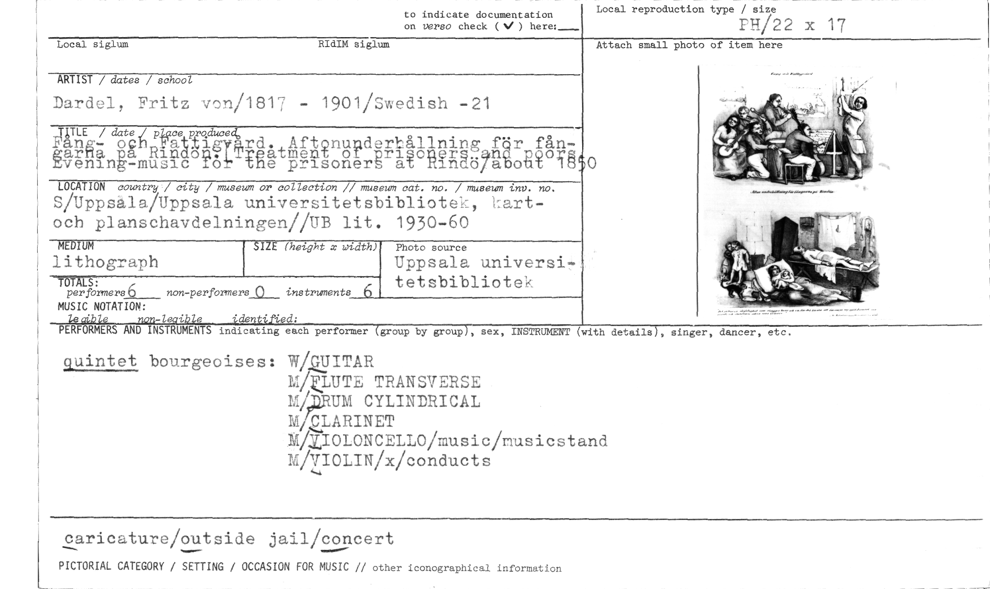 //// to indicate documentation //// on verso check (V) here:._-- //// Local reproduction type / size //// PH/22 x 17 //// Local siglum RIdIM siglum Attach small photo of item here //// ARTIST / dates / school //// Dardel, Fritz von/1817 - 1901/Swedish -21 //// Fän- ogh Fa II A1Rattrd. Aft2nupderbållning för fån- //// Tgu / date plac/pnduced. //// geiRgnemälhelh 1RåoarErAP RiKäö'hoRPfg 0 //// LOCATION ~,y1 city / museum or collection // museum cat. no. / museum inr. no. //// S/Uppsäla/Uppsala universitetsbibliotek, kart-och planschavdelningen//UB lit. 1930-60 //// MEDIUM lithograph //// TOTALS: //// per formers 6 non-perforxers_n___ instruments //// MUSIC NOTATION: //// -1 e 'de //// PERFORMERS AND INSTRUMENTS indicating each performer //// SIZE (hevght x uidth) //// Photo source //// Uppsala universi tetsbibliotek //// group by group , sex, INSTRUMENT (with details), singer, dancer //// quintet bourgeoises: W/ UITAR //// M ZLUTE TRANSVERSE M/ UM CYLINDRICAL M/ QyARINET //// MtIIOLONCELLO/music/musicstand //// M/UOLIN/x/conducts //// caricature/outside jail/concert //// PICTORIAL CATEGORY / SETTING / OCCASION FOR MUSIC // other iconographical information ////