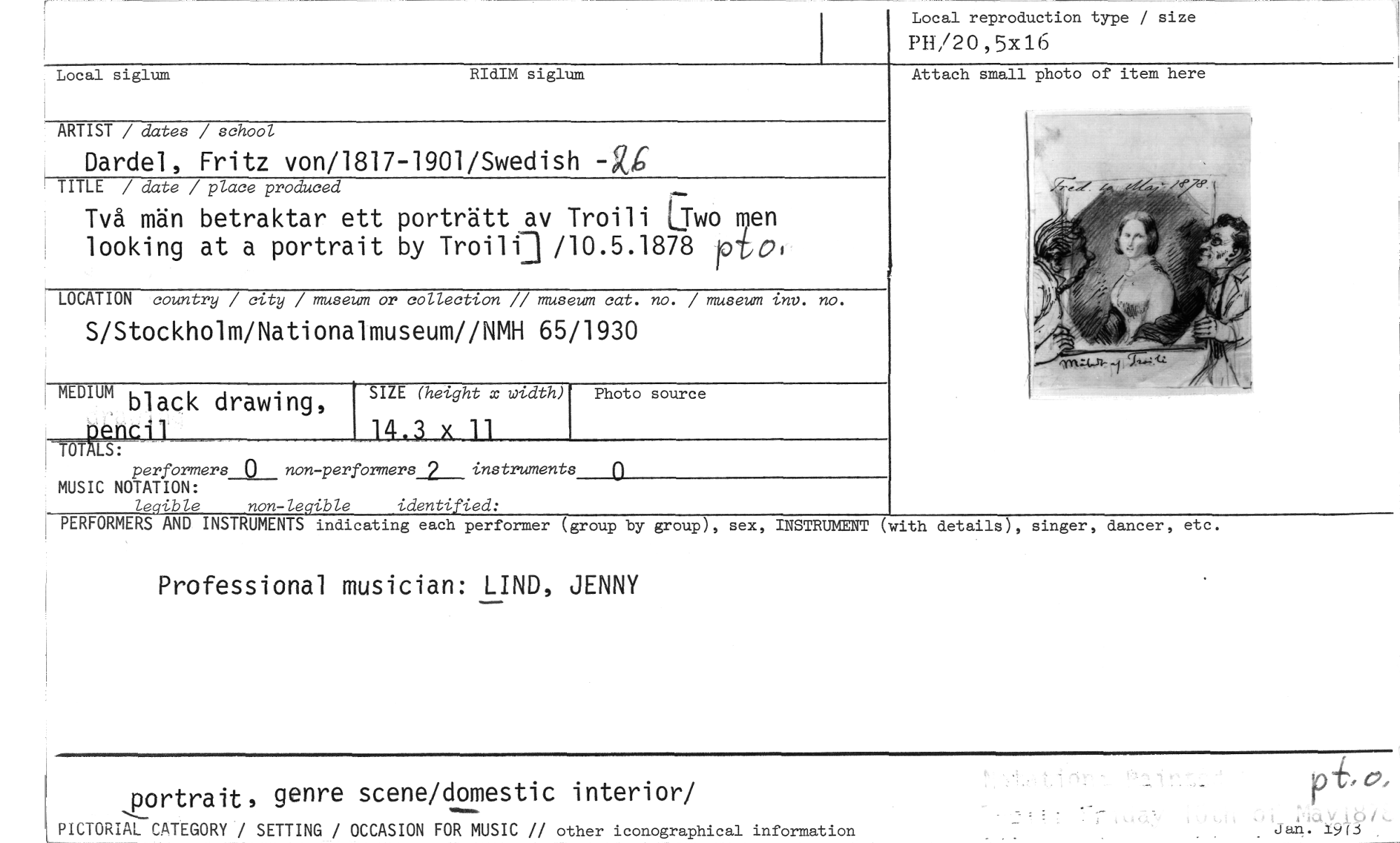 //// Local reproduction type / size //// PB/20 , 5x 16 //// Local siglum RIdIM siglum //// ARTIST / dates / school //// Dardel, Fritz von/1817-1901/Swedish -g4 //// TITLE / date / place produced //// Två män betraktar ett porträtt av Troili LTwo en looking at a portrait by Troilij /10.5.1878 ptifell //// LOCATION country / city / museum or collection // museum cat. no. / museum inv. no. //// S/Stockholm/Nationalmuseum//NMH 65/1930 //// Photo source //// Attach small photo of item here //// MEDIUM black drawing, ' SIZE (height x width) //// j4.3 x 11 //// //// performers 0 non-performers2_ instruments MUSIC NOTATION: //// Le ible non-le ible identi ied: //// PERFORMERS AND INSTRUMENTS indicating each performer (group //// by group), sex, INSTRUMENT (with details), singer, dancer, etc. //// 0 //// Professional musician: LIND, JENNY //// portrait, genre scene/domestic interior/ //// PICTORIAL CATEGORY / SETTING / OCCASION FOR MUSIC // other iconographical information Ja4. 19(3 ////