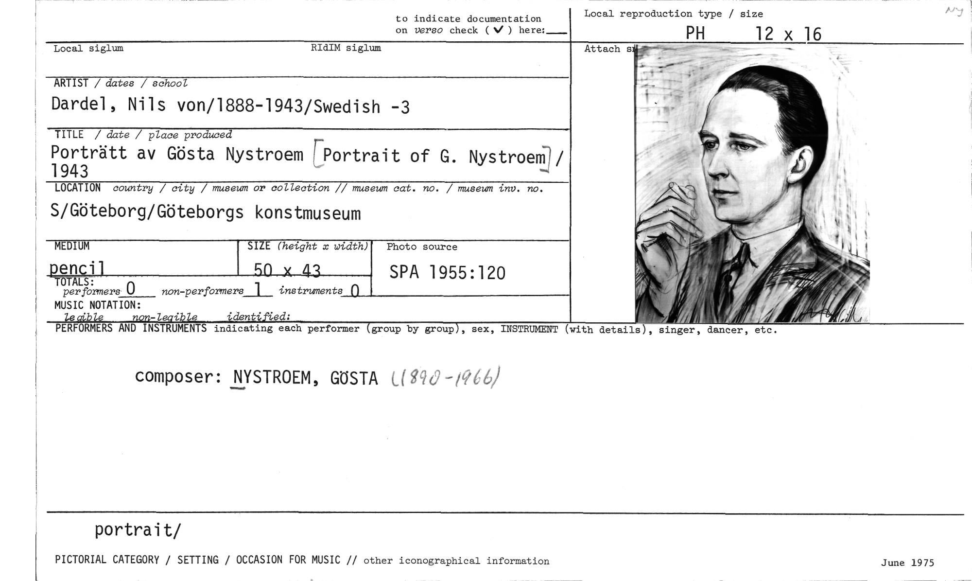 //// to indicate documentation //// on versa check ( ) here:- //// Local reproduction type / size //// PH 12 x 16 //// Local siglum RIdIM siglum //// Attach //// ARTIST / dates / school //// Dardel, Nils von/1888-1943/Swedish -3 //// TITLE / date / place produced //// Porträtt av Gösta Nystroem rPortrait of G. NystroeM7/ 1943 //// LOCATION country / city / museum or collection // museum cat. no. / museum inv. no. //// S/Göteborg/Göteborgs konstmuseum //// MEDIUM //// Photo source //// SIZE (height x width) //// SPA 1955:120 //// •en i //// S: //// performers 0 non-performers_l__ instruments 0 //// MUSIC NOTATION: //// 7z aible_ non-leaible identified: //// PERFORMERS AND INSTRUMENTS indicating each performer (7.7c7117777477,17173), sex, INSTRUMENT (with details), singer, dancer, etc. //// composer: NYSTROEM, GÖSTA 1(g90-/960 //// portrait/ //// PICTORIAL CATEGORY / SETTING / OCCASION FOR MUSIC // other iconographical information //// June 1975 ////