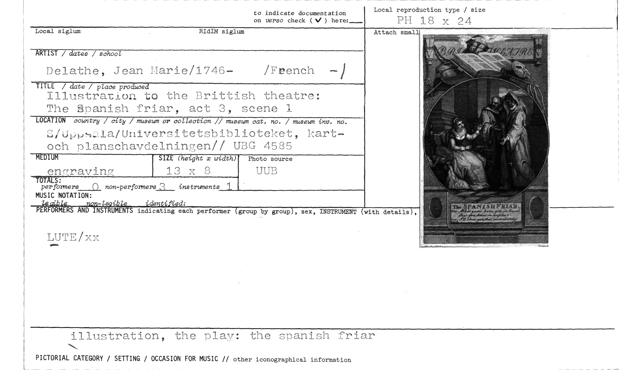 //// to indicate documentation //// on verso check (V ) here:___ //// Local reproduction type / size //// PH 18 x 24 //// Local siglum RIdIM siglum //// ARTIST / dåtes / school //// Delathe, Jean Marie/1746- /Feench //// TITLE / date / place produced //// Illustration to the Brittish theatre: The Bpanish friar, act 3, scene 1 //// LOCATION country '1 city / museum or collection // museum cat. no. / museum inv. no. //// S/UiJmhia/Universitetsbiblioteket, kart-och planschavdelningen// UBG 4585 //// MEDIUM SIZE (height x width) Photo source //// engraving 13 x 8 UUB //// 11T7LS: //// per formers non-perfbrmers 3 instruments //// MUSIC NOTATION: //// Zeaible non-leail* Wentifi.od; //// PERFORMERS AND INSTRUMENTS indicating each performer (group by group), sex, INSTRUMENT //// LUTE/xx //// ith details), //// Attach small //// illustration, the play: the spanish friar //// PICTORIAL CATEGORY / SETTING / OCCASION FOR MUSIC. // other iconographical information ////