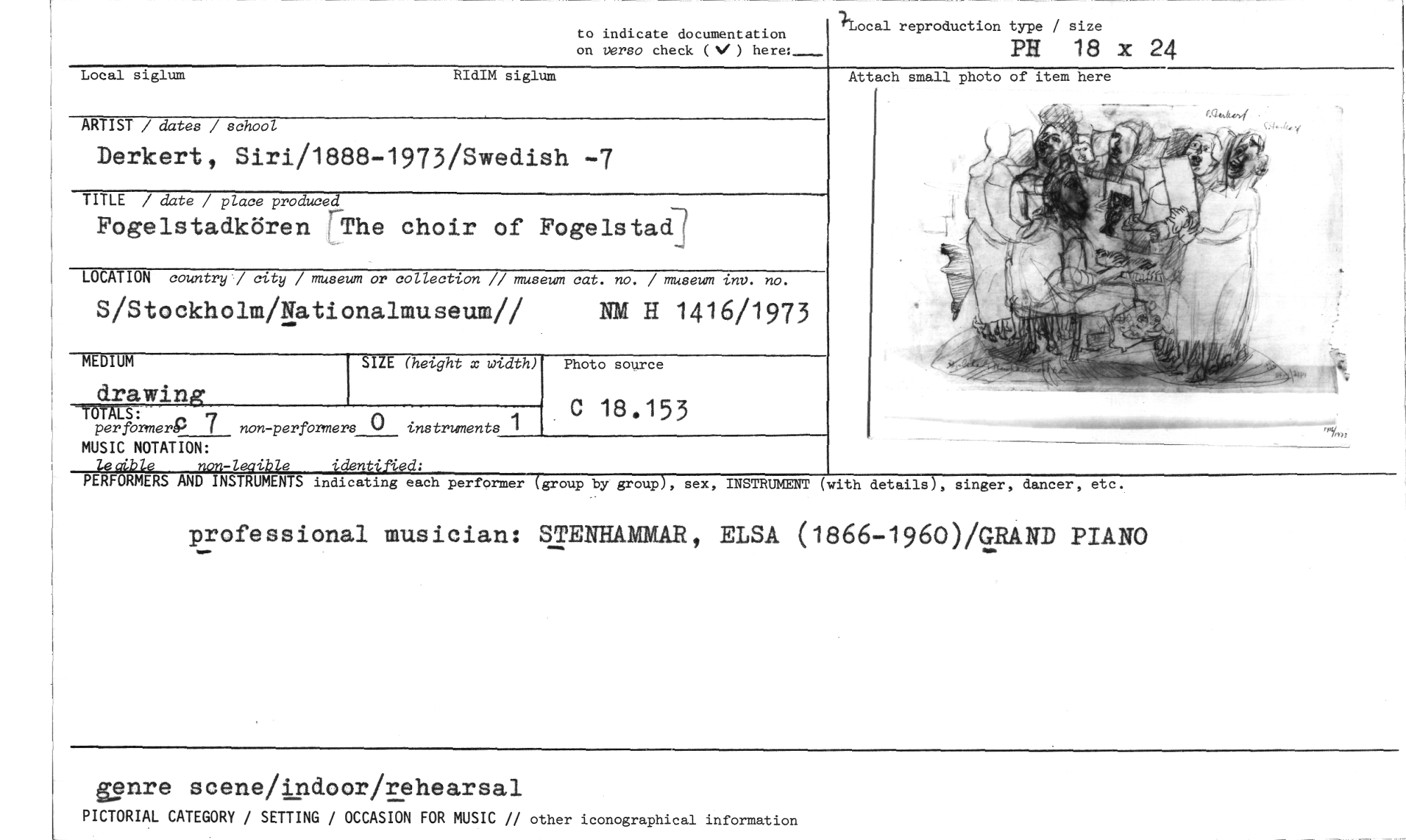 //// to indicate documentation //// on versa check ( ) here:- //// ltocal reproduction type / size //// PH 18 x 24 //// Attach small photo of item here //// tc; //// TITLE / date / place produced //// Fogelstadkören The choir of Fogelstad7 //// MEDIUM //// 4plating //// LS: //// MUSIC NOTATION: //// lecible non-leaible identified: //// PERFORMERS AND INSTRUMENTS indicating each performer (group by group), sex, INSTRUMENT (with details), singer, dancer, etc. //// professional musician: STENHAMMAR, ELSA (1866-1960)/GRAND PIANO //// Local siglum RIdIM siglum //// ARTIST / dates / school //// Derkert, Siri/1888-1973/Swedish —7 //// LOCATION country / city / museum or collection // museum cat. no. / museum inv. no. //// S/Stockholm/Nationalmuseum// NM H 1416/1973 //// performerb-; I non-performers 0 instruments 1 //// SIZE (height x width) //// Photo source //// C 18.153 //// genre scene/indoor/rehearsal //// PICTORIAL CATEGORY / SETTING / OCCASION FOR MUSIC // other iconographical information ////