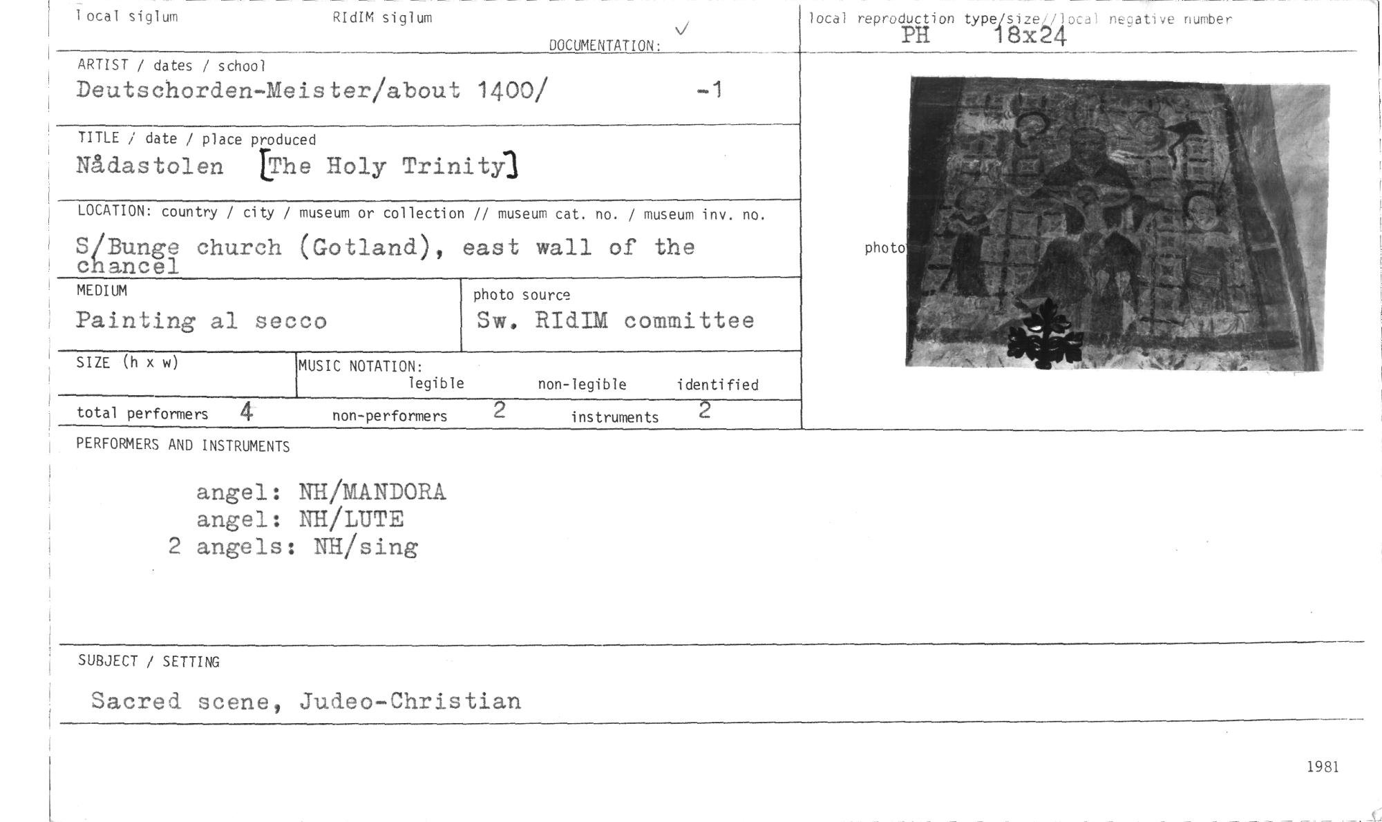 //// 1981 //// -1 //// ARTIST / dates / school //// Deutschorden-Meister/about 1400/ //// 2 //// total performers 4 //// non-performers instruments //// photo //// local reproductHion type/size,1 :. 10c r<__ati e number //// P l8x24 //// DOCUMENTATION: //// TITLE / date / place produced //// Nådastolen tThe Holy TrinitY3 //// LOCATION: country / city / museum or collection // museum cat. no. / museum inv. no. //// S/Bunge church (Gotland), east wall of the //// chancel //// photo source //// Sw. RIdIM committee //// MUSIC NOTATION: //// legible non-legible identified //// MEDIUM //// Painting al secco //// SIZE (h x w) //// RERFORMERS AND INSTRUMENTS //// angel: NH/MANDORA angel: NH/LUTE //// 2 angels: NH/sing //// SUBJECT / SETTING //// Sacred scene, Judeo-Christian //// RIdIM siglum //// 1 ocal siglum ////