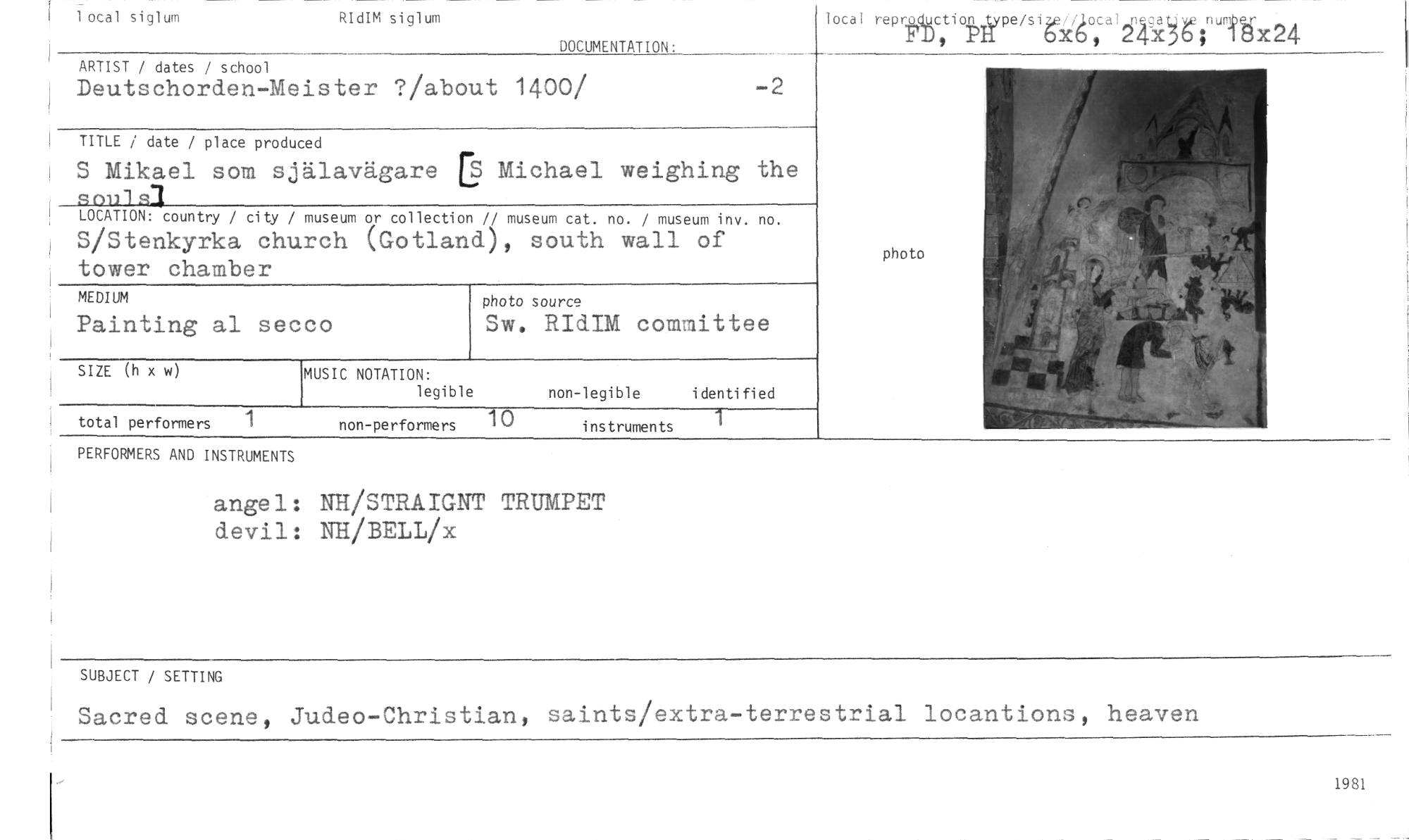 //// PERFORMERS AND INSTRUMENTS //// angel: NH/STRAIGNT TRUMPET devil: NR/BELL/x //// SUBJECT / SETTING //// Sacred scene, Judeo-Christian, saints/extra-terrestrial locantions, heaven //// RIdIM siglum //// 1 ocal siglum //// -2 //// ARTIST / dates / school //// Deutschorden-Meister ?/about 1400/ //// 1 //// total performers //// non-performers 10 instruments 1 //// DOCUMENTATION: //// TITLE i date / place produced //// S Mikael som själavägare [p Michael weighing the //// snu1.93 LOCATION: country / city / museum or collection // museum cat. no. / museum inv. no. //// S/Stenkyrka church (Gotland), south wall of tower chamber //// photo source //// Sw. RIdIM committee //// SIZE (h x w) //// non-legible identified //// lotal repr4,44ctigkilype/sigesgo,ca121gjac;numiasx24 //// nu, r //// MEDIUM //// Painting al secco //// MUSIC NOTATION: //// legible //// 1981 ////