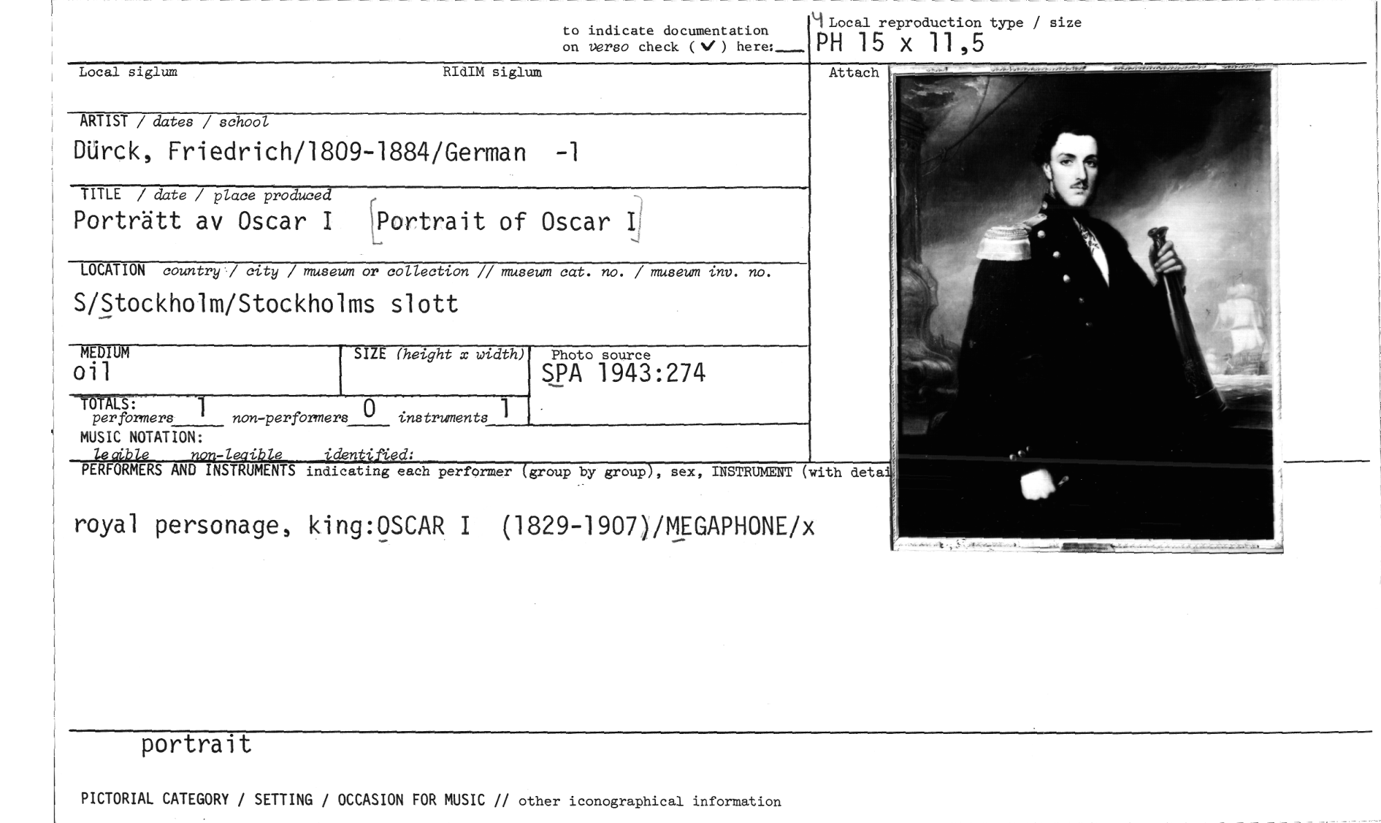 //// 4 Local reproduction type / size //// on versa check (V) here:___ PH 15 x 11,5 //// to indicate documentation //// Local siglum RIdIM siglum //// Attach //// ARTIST / dates / school //// DUrck, Friedrich/1809-1884/German //// TITLE / date / place produced //// Porträtt av Oscar I Yortrait of Oscar r //// LOCATION country / city / museum or collection /1 museum cat. no. / museum inv. no. //// S/Stockholm/Stockholms slott //// MEDIUM //// 011 //// Photo source //// SITE (height x width) //// SPA 1943:274 //// TÖTALS: //// 1 //// per formers non -perfemners ° instruments 1 //// MUSIC NOTATION: //// _ leaihle non-leaible identified: //// PERFORMERS AND INSTRUMENTS indicating each performer (group by group), sex, INSTRUMENT (with detal, //// royal personage, king:OSCAR I (1829-1907)/MEGAPHONE/x //// portrait //// PICTORIAL CATEGORY / SETTING / OCCASION FOR MUSIC 1/ other iconographical information ////