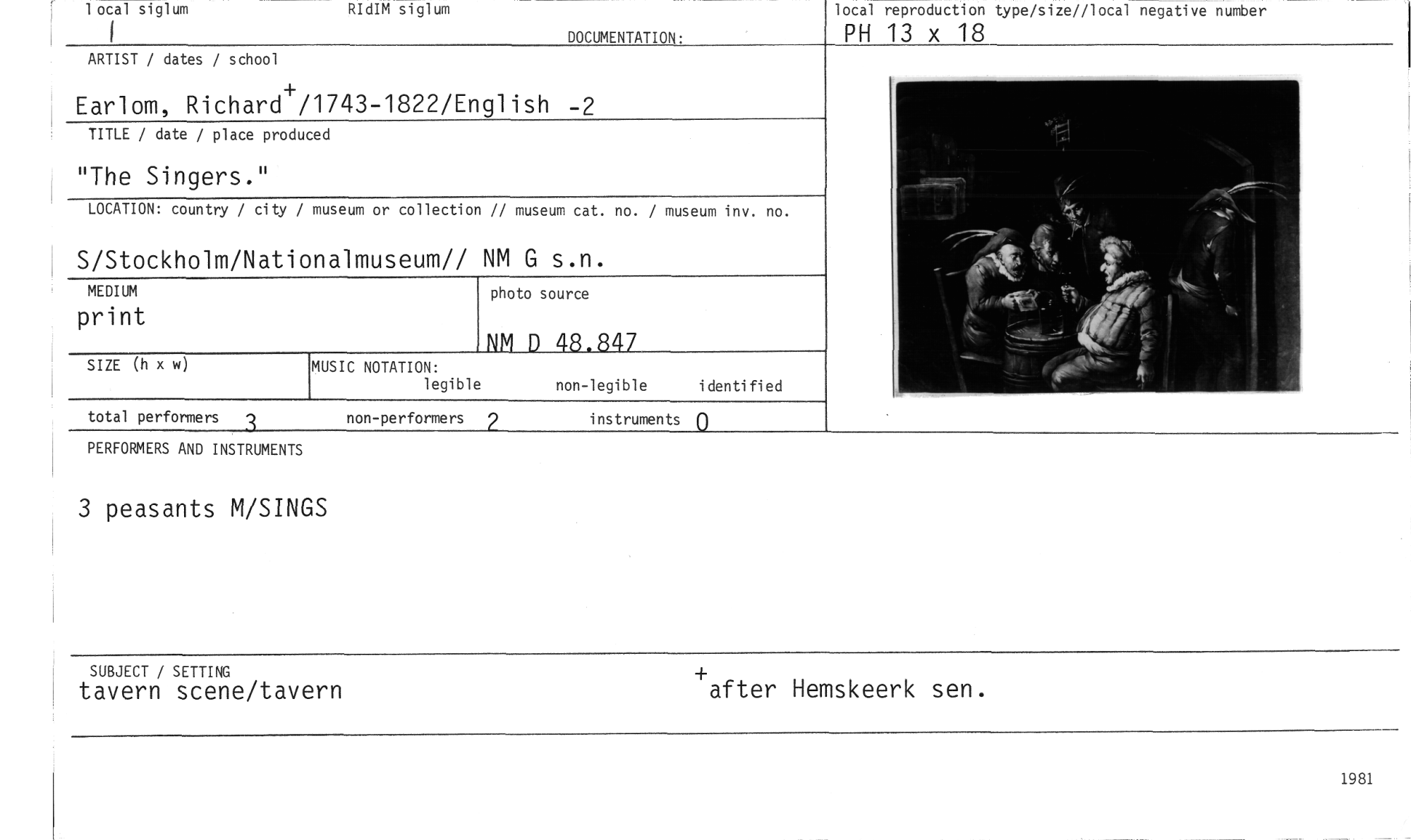 //// 1 ocal siglum //// RIdIM siglum //// DOCUMENTATION: //// local reproduction type/size//local negative number //// PH 13 x 18 //// ARTIST / dates / school //// Earlom, Richard+/1743-1822/English - //// TITLE / date / place produced //// "The Singers." //// LOCATION: country / city / museum or collection // museum cat. no. / museum inv. no. //// S/Stockholm/Nationalmuseum// NM G s.n. //// MEDIUM //// print //// SIZE (h x w) //// MUSIC NOTATION: //// legible non-legible identified //// photo source //// NM D 48.847 //// total performers non-performers 2 instruments //// PERFORMERS AND INSTRUMENTS //// 3 peasants M/SINGS //// SUBJECT / SETTING +after Hemskeerk sen. //// tavern scene/tavern //// 1981 ////