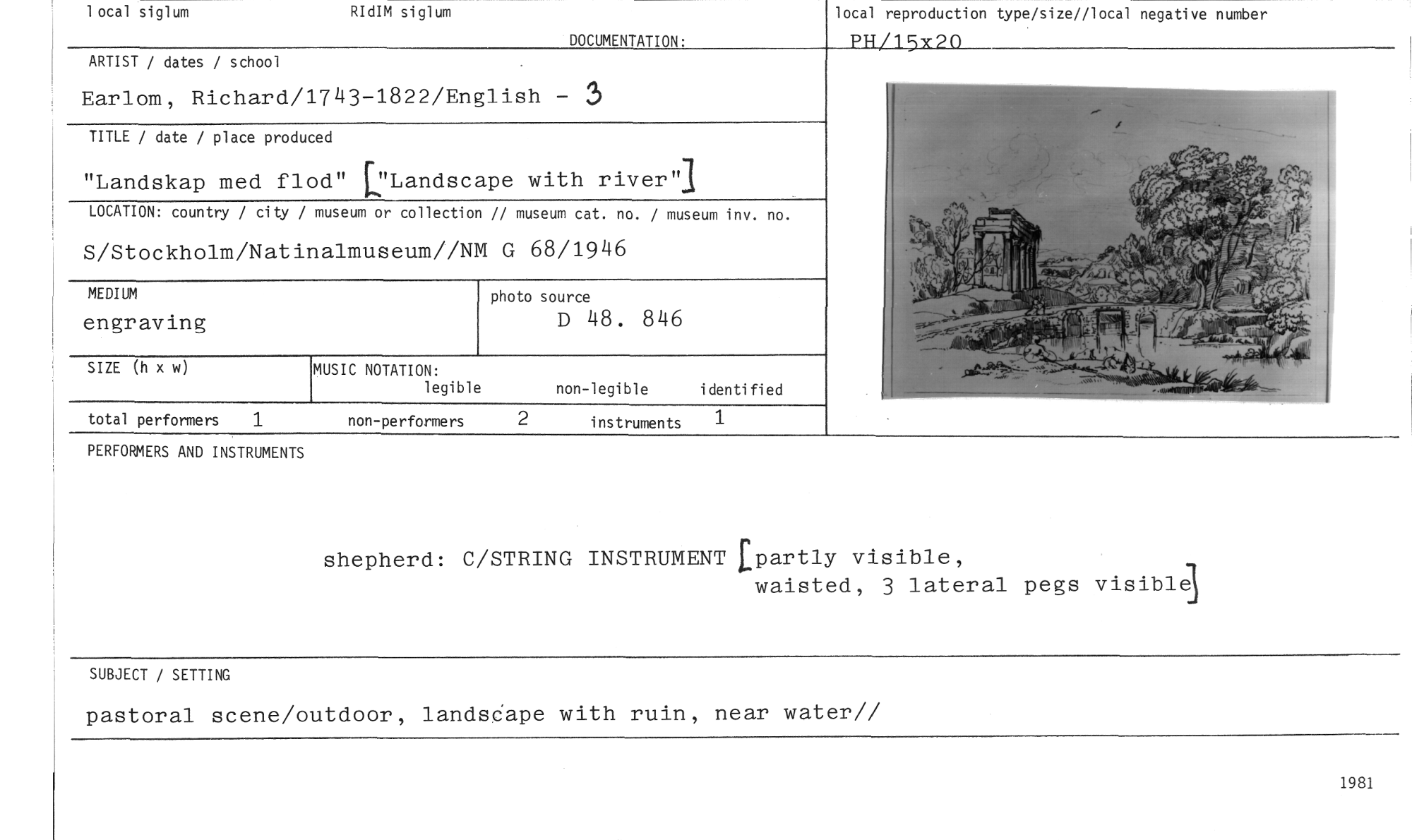 //// local siglum RIdIM siglum //// DOCUMENTATION: //// local reproduction type/size//local negative number PH/153(20 //// ARTIST / dates / school //// 1981 //// total performers 1 //// non-performers 2 instruments 1 //// Earlom, Richard/1743-1822/English - 3 //// TITLE / date / place produced //// "Landskap med flod" 'Landscape with river" //// LOCATION: country / city / museum or collection // museum cat. no. / museum inv. no. //// S/Stockholm/Natinalmuseum//NM G 68/1946 //// photo source //// D 48. 846 //// SIZE (h x w) //// non-legible i denti fi ed //// MEDIUM //// en gr av ing //// MUSIC NOTATION: //// legible //// PERFORMERS AND INSTRUMENTS //// shepherd: C/STRING INSTRUMENT Epartly visible, //// waisted, 3 lateral peps visiblel //// SUBJECT / SETTING //// pastoral scene/outdoor, landsdape with ruin, near water// ////