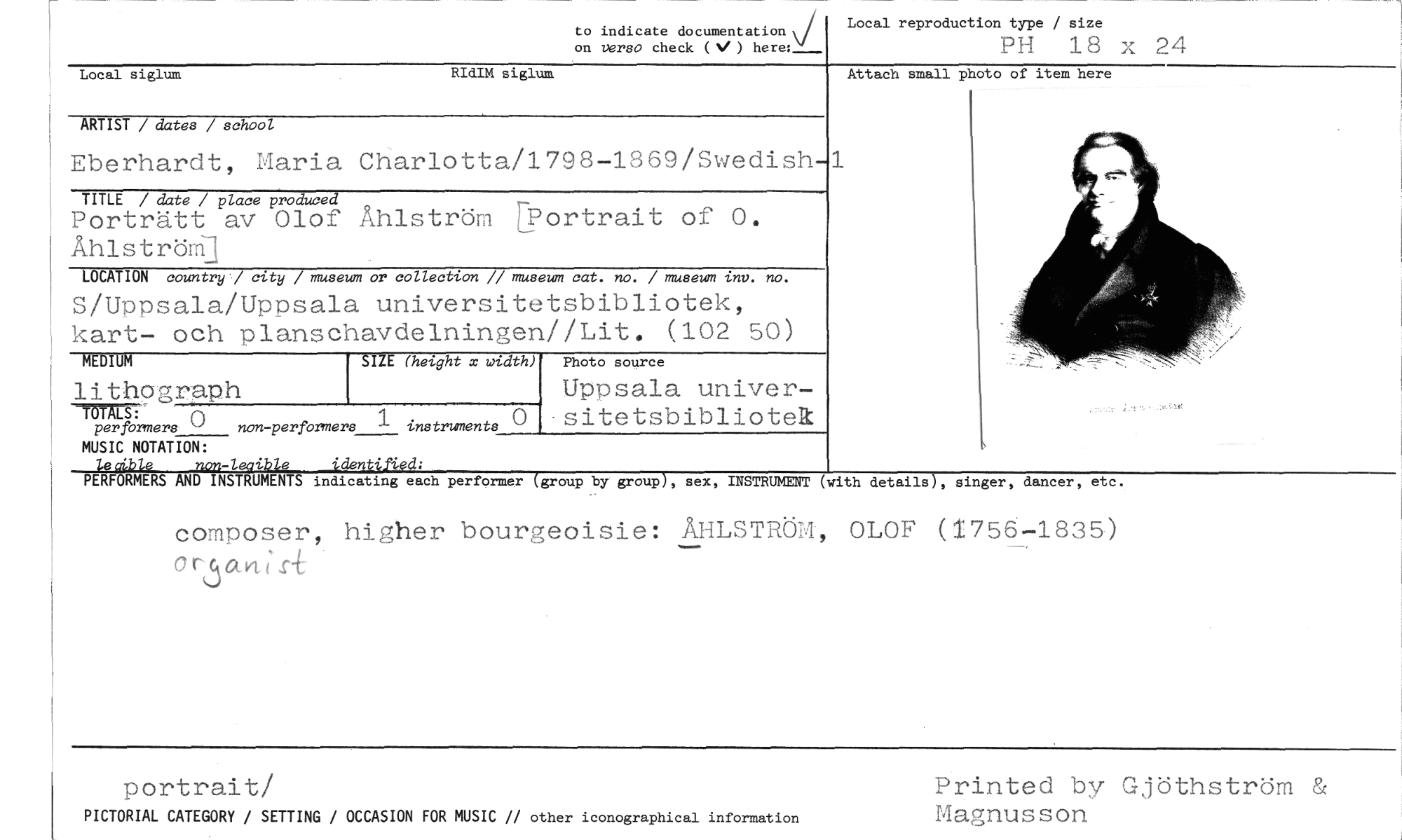 //// to indicate documentation \i/ on verso check (\I ) here:_--- //// Local reproduction type / size //// PH 18 x 24 //// 1 //// Local siglum RIdIM siglum //// ARTIST / dates / school //// Eberhardt, Maria Charlotta/1798-1869/Swedish- //// TITLE / date / place produced //// Porträtt av Olof Åhlström Eportrait of 0. AhlströM1 //// LOCATION country / city / museum or collection // museum cat. no. / museum inv. no. //// S/Uppsala/Uppsala universitetsbibliotek, kart- och planschavdelningen//Lit. (102 50) //// MEDIUM SIZE (height x width) Photo source Attach small photo of item here //// Uppsala univer- //// sitetsbibliotek //// li.thograph //// TOTALS: r) //// perfbrners " non-performers instruments //// MUSIC NOTATION: //// tecrale non-leaible identtfied; //// PERFORMERS //// AND INSTRUMENTS indicating each performer (group by group), sex, INSTRUMENT (with details), singer, dancer, etc. //// composer, higher bourgeoisie: ÅHLSTRÖM, OLOF (1756-1835) 0 rå anl.r.L. //// Dortrait/ Printed by Gjöthström Magnusson //// PICTORIAL CATEGORY / SETTING / OCCASION FOR MUSIC // other iconographical information ////