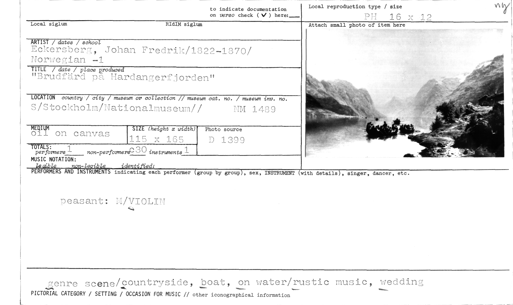 //// to indicate documentation Local reproduction type / size //// on verso check (V) here: P H 16 x 12 //// Local siglum RIdIM siglum //// Attach small photo of item here //// ARTIST / datea / school //// Eckersberg, Johan Fredrik/1322-1870/ Norwegian -1 //// TITLE / date / place groduced //// "Brudfärd pa Hardangerfjorden" //// LOCATION country / city / museum or collection // museum cat. no. / museum inv. no. //// S/Stockholm/Mationalmuseum// MM 1489 //// MEQIUM //// ol1 on canvas //// -TÖTALS: 1 //// per formers non-performermg=3() instruments 1 //// MUSIC NOTATION: //// non-legible identified: //// PERFORMERS AND INSTRUMENTS indicating each performer (group by group), sex, INSTRUMENT (with details), singer, dancer, etc. //// peasant: ii/VIOLIN //// SIZE (height x width) //// 115 x 165 //// Photo source //// D 1399 //// .enro scene/countrvside, boat, on water/rustic music, wedding //// PICTORIAL CATEGORY / SETTING / OCCASION FOR MUSIC // other iconographical information ////