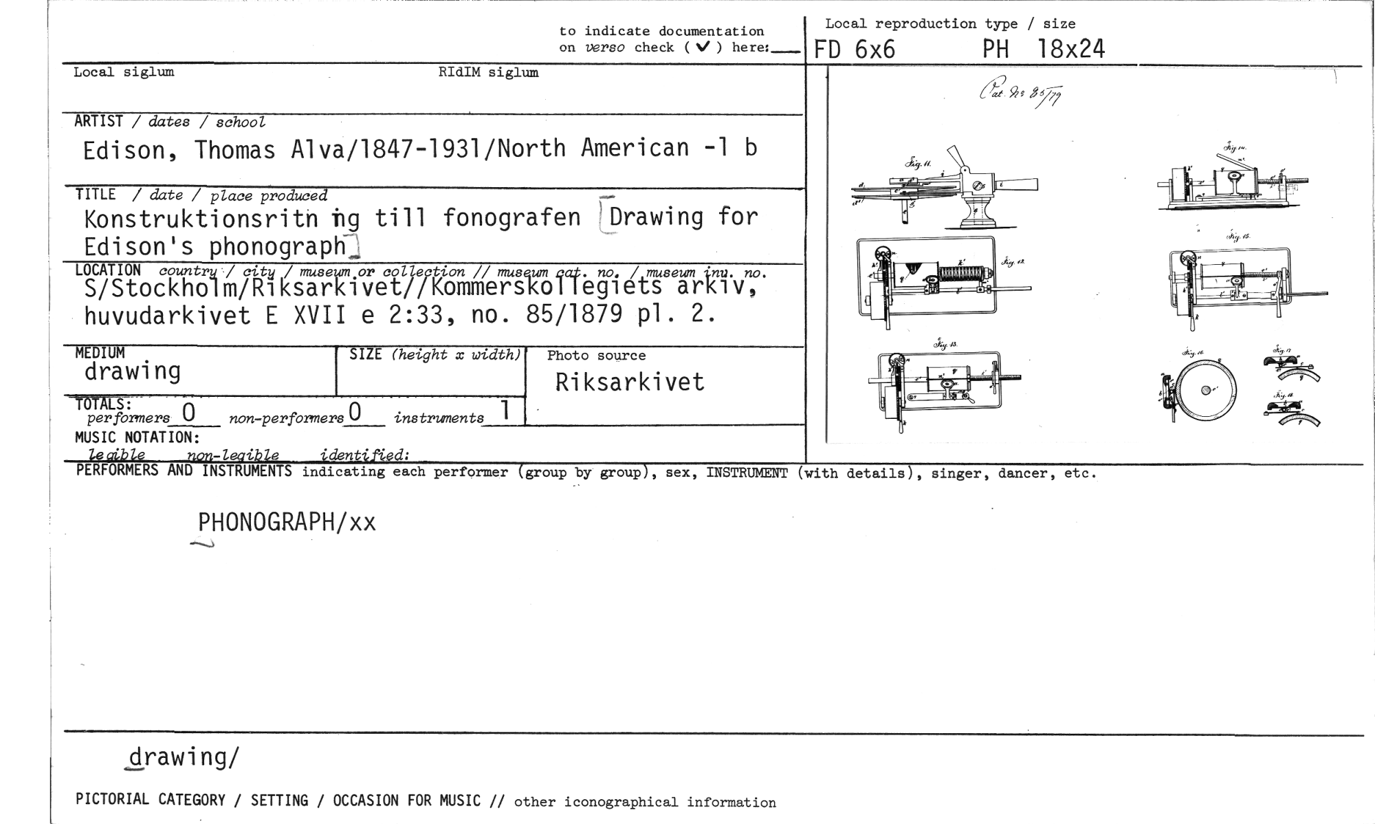 //// to indicate documentation //// on verso check (V ) here: //// FD 6x6 PH 18x24 //// Local reproduction type / size //// Local siglum RIdIM siglum //// ARTIST / dates / school //// Edison, Thomas Alva/1847-1931/North American -1 b //// TITLE / date / place produced //// Konstruktionsritn tig till fonografen Drawing for Edison's phonographl //// LOCATION country7 city / museum or collection // musaum Jat. / mmewinv. no. //// S/Stockholm/Riksarkivet//Kommerskollegiets arkiv, huvudarkivet E XVII e 2:33, no. 85/1879 pl. 2. //// SIZE (height x width) //// TOTALS: //// per formers 0 non-perfortters 0 instruments 1 //// MUSIC NOTATION: //// leaible non-leaible identified: //// PERFORMERS AND INSTRUMENTS indicating each performer (group by group), sex, INSTRUMENT //// PHONOGRAPH/xx //// MEDIUM //// drawi ng //// Photo source //// Riksarkivet //// EbehtffloWy, ,~4~4M501 //// 11.11~ //// estJ'.4g" //// (with details), singer, dancer, etc. //// drawing/ //// PICTORIAL CATEGORY / SETTING / OCCASION FOR MUSIC // other iconographical information ////