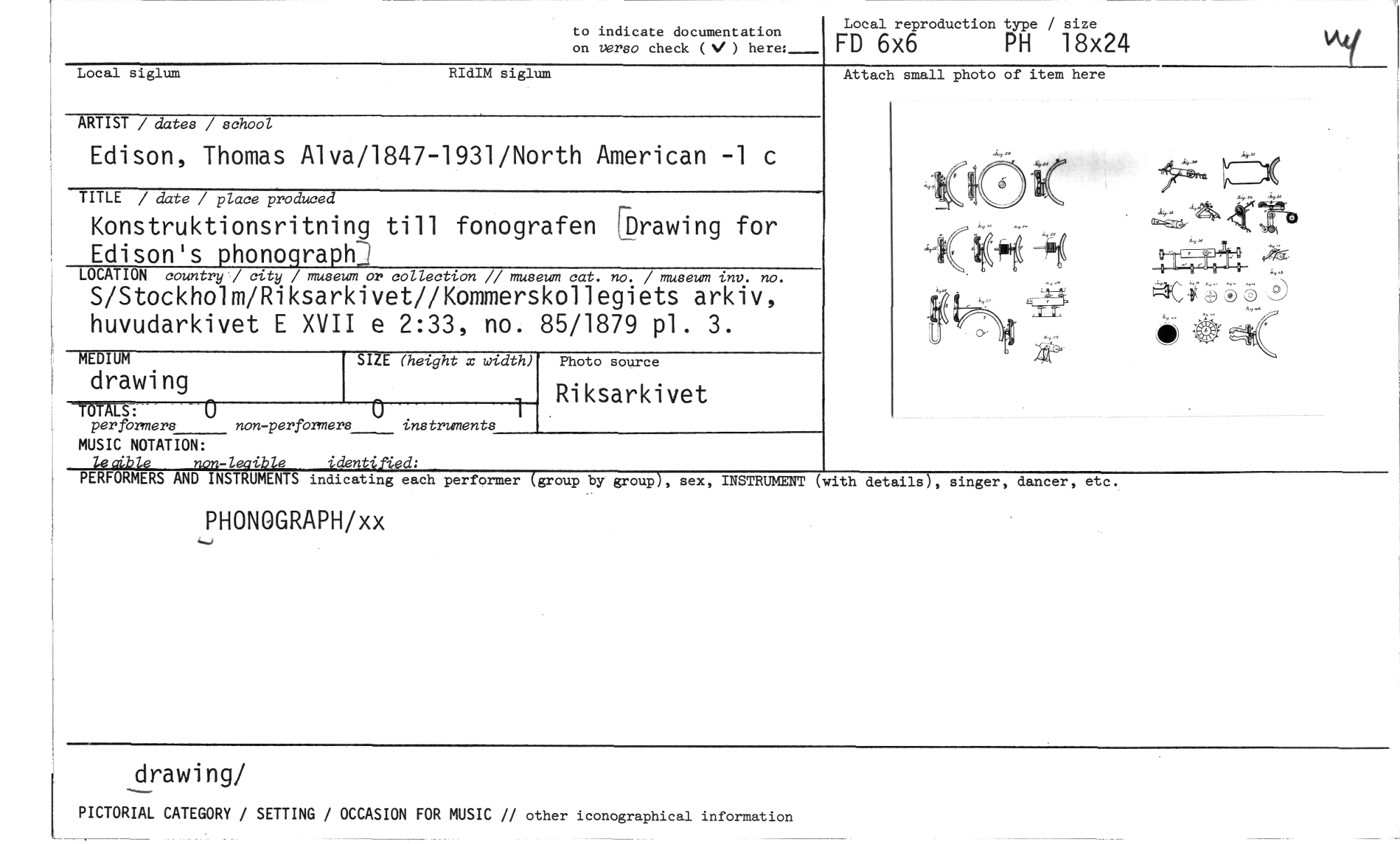 //// to indicate documentation on verso check (V ) here: //// Local reproduction type / size //// FD 6x6 PH 18x24 //// Local siglum RIdIM siglum //// ARTIST / dates / school //// Edison, Thomas Alva/1847-1931/North American -1 c //// TITLE / date / place produced //// Konstruktionsritning till fonografen Irawing for //// Edison's phonographD //// LOCATION country / city / museum or collection // museum cat. no. / museum inv. no. //// S/Stockholm/Riksarkivet//Kommerskollegiets arkiv, huvudarkivet E XVII e 2:33, no. 85/1879 pl. 3. //// MEDIUM SIZE (height x width) Photo source //// drawing Riksarkivet //// T1=0 per formers non-performers 0 //// instruments //// MUSIC NOTATION: //// Attach small photo of item here //// lik //// Zeable non-lecible //// PERFORMERS AND INSTRUMENTS indicating each performer (group by group), sex, //// PHONOGRAPH/xx INSTRUMENT (with details), singer, dancer, etc. //// drawi ng/ //// PICTORIAL CATEGORY / SETTING / OCCASION FOR MUSIC // other iconographical information ////