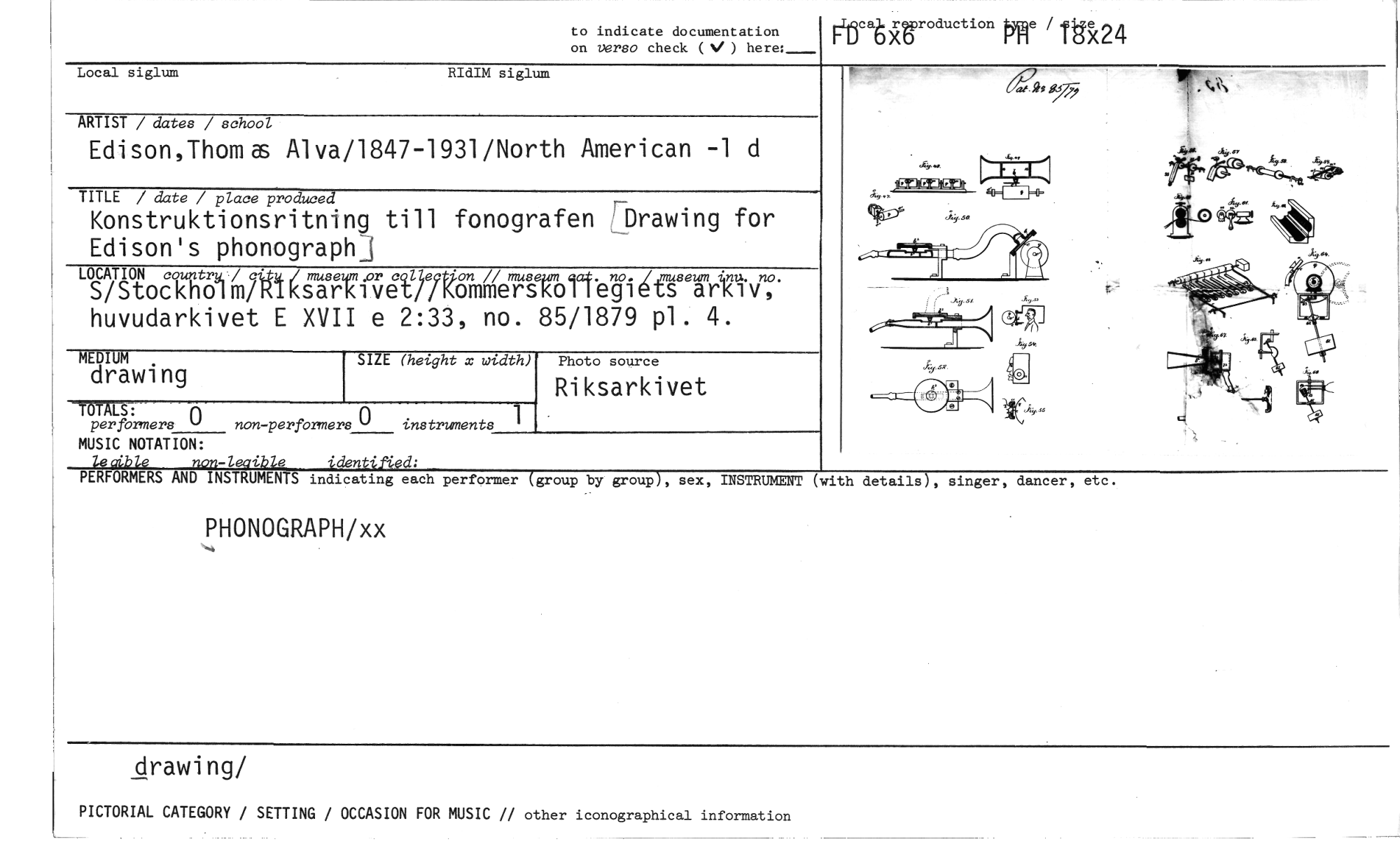 //// to indicate documentation //// on verso check (V ) here:_ //// Flt5c at Agroduct lon Me tk24 //// Local siglum RIdIM siglum //// 471.155, //// • \ //// ARTIST / dates / school //// Edison,Thom Alva/1847-1931/North American -1 d //// TITLE / date / place produced //// Konstruktionsritning till fonografen Drawing for Edison's phonographj //// LOCATION countrki musewnar colZection // museum no. / museum 'nu. no. //// S/Stockholm/R1ksarkivet//KommersKi i at. egiets //// huvudarkivet E XVII e 2:33, no. 85/1879 pl. 4. //// SIZE (height x width) //// MEDIUM //// drawing //// Photo source //// Riksarkivet //// TÖTALS: //// per formers 0 non -performers 0 instruments 1 //// MUSIC NOTATION: //// te4b/e non-legible identiff4d; //// PERFORMERS AND INSTRUMENTS indicating each performer (group by group), sex, INSTRUMENT (with details), singer, dancer, etc. //// PHONOGRAPH/xx //// drawing/ //// PICTORIAL CATEGORY / SETTING / OCCASION FOR MUSIC // other iconographical information ////