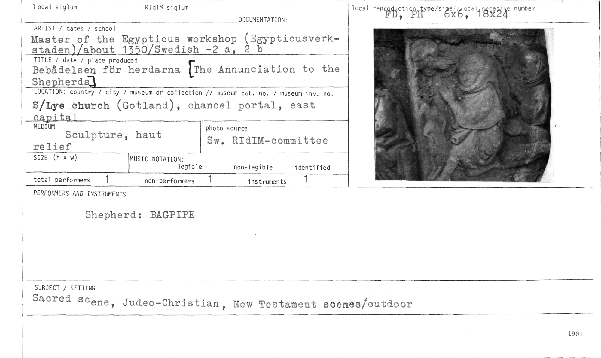 //// 1 ocal siglum RIdIM siglum //// lotal repcm4kctiokilype/siäiocd;15.är number //// rD, xhio, i //// DOCUMENTATION: //// ARTIST / dates / school //// Master of the Egypticus workshop (Egypticusverk- //// staden)/about 1350/Swedish -2 a, 2 b //// TITLE / date / place produced //// Bebådelsen för herdarna [The Annunciation to the //// Shepherdj3 //// LOCATION: country / city / museum or collection // museum cat. no. / museum inv. no. //// S/Lye church (Gotland), chancel portal, east //// capital //// MEDIUM //// Sculpture, haut relief //// MUSIC NOTATION: //// legible non-legible identified //// total performers 1 non-performers 1 instruments 1 //// SIZE (h x w) //// photo source //// Sw. RIdIM-committee //// PERFORMERS AND INSTRUMENTS //// Shepherd: BAGPIPE //// SUBJECT / SETTING //// Sacred sc ene, Judeo-Christian, New Testament scenesioutdoor //// 1981 ////