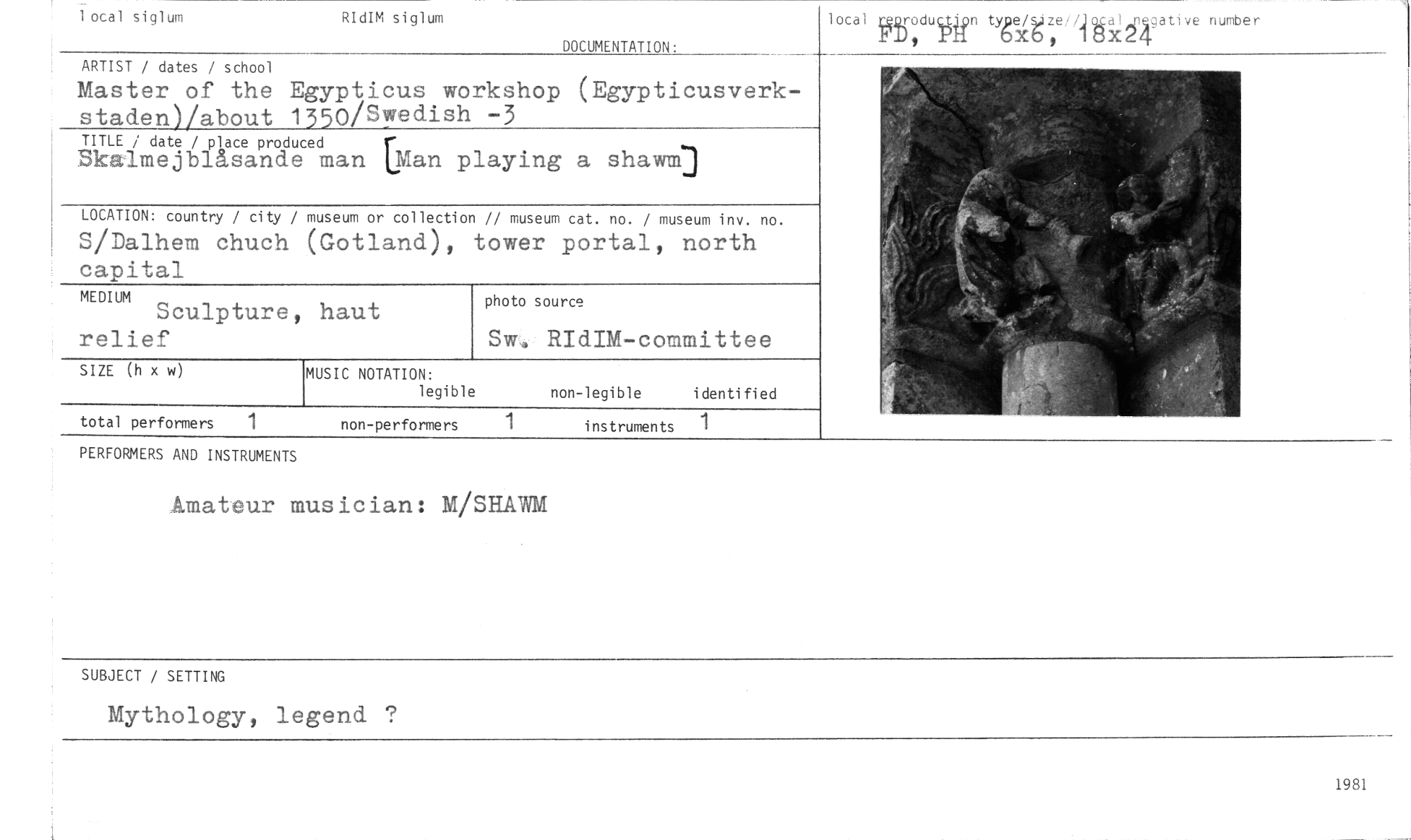 //// 1 ocal siglum RIdIM siglum //// DOCUMENTATION: //// local grodu k4 n typie/X610yze,/jsI4,-.at e noter //// -tri) O //// ARTIST / dates / school //// Master of the Egypticus workshop (Egypticusverkstaden)Jabout 1350/Swedish -3 //// Bkalmejblåsande man Man playing a shawm //// TITLE / date / place produced //// LOCATION: country / city / museum or collection // museum cat. no. / museum inv. no. //// S/Dalhem chuch (Gotland), tower portal, north capital //// MEDIUM //// Sculpture, haut relief //// SIZE (h x w) //// non-legible identified //// total performers 1 non-performers 1 instruments 1 //// MUSIC NOTATION: //// legible //// photo source //// Sw. RIdIM-committee //// PERFORMERS AND INSTRUMENTS //// Amateur musician: M/SHA4M //// SUBJECT / SETTING //// Mythology, legend ? //// 1981 ////