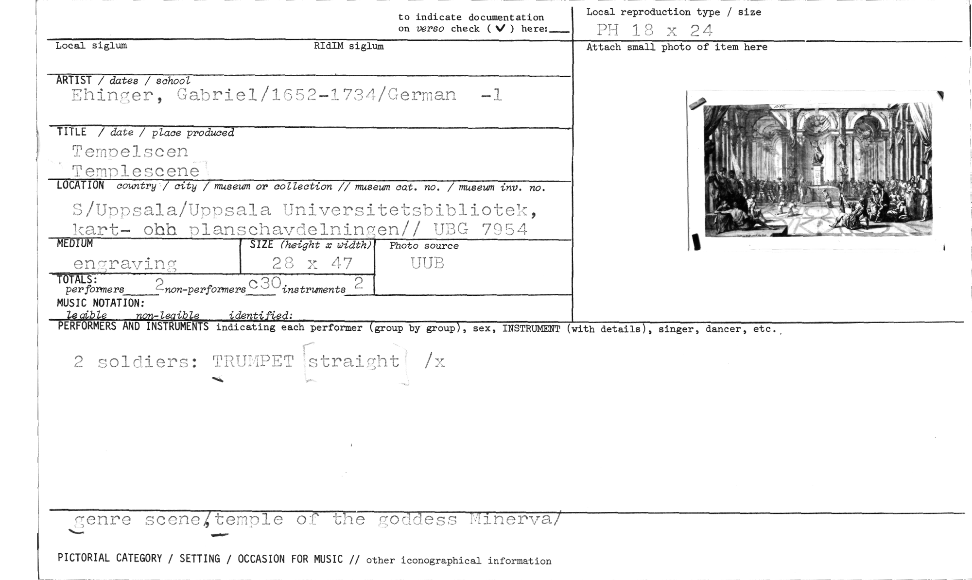 //// to indicate documentation Local reproduction type / size //// on verso check (V ) here:--- PH 13 x 24 //// Local siglum RIdIM siglum //// ARTIST / dates / school //// Ehinger, Gabrie1/1652-1734/German -1 //// TITLE / date / place produced //// Attach small photo of item here //// Tempelscen Templescene //// LOCATION country,/ city / museum or collection // museum cat. no. / museum int,. no. //// S/Uppsala/Uppsala Universitetsbibliotek, kart- ohh planschavdelningen// UBG 7954 //// —710111m SIZE (height x width) Photo source //// engraving 28 x 47 UUB //// 2() //// per formers 4-non-performers r,"""instruments //// MUSIC NOTATION: //// non-legible identified: //// PERFORMERS AND INSTRUMENTS indicating each performer (group by group), sex, INSTRUMENT (with details), singer, dancer, etc., //// 2 soldiers: TRUMPET straight / //// genre scene temule o e goc ess binerva //// PICTORIAL CATEGORY / SETTING / OCCASION FOR MUSIC // other iconographical information ////