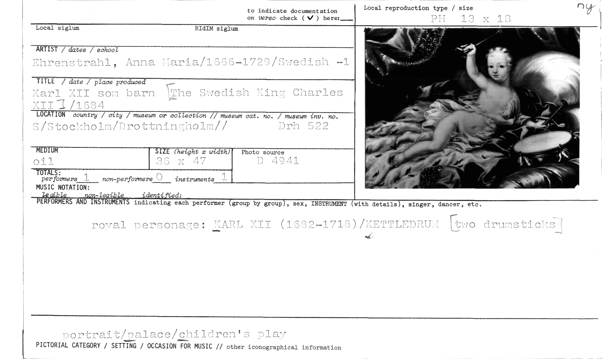 //// Local reproduction type / size //// PIl 13 x //// to indicate documentation //// on verso check ( ) here:_ //// Local siglum RIdIM siglum //// ARTIST / dates / school //// Ehrenstrahl, Anna Maria/1366-1729/Swedish -1 //// TITLE / date / place produced //// Karl XII som barn The Swedish Xin Charles KII-1/1834 //// LOCATION country" city / museum or collection // museum cat. no. / museum inv. no. //// S/Stockholm/Drottningholm// .)rh 522 //// nu (height x width) //// 36 x 47 //// TOTALt //// perfbrmers 1 non-performers C) instruments //// MUSIC NOTATION: //// MEDIUM //// oil //// Photo source //// D 4941 //// PEUCERS AfirriXibift indicating ;:ch performer-(group by group), sex, INSTRUMENT (with details), singer, dancer, etc. //// royal personage: ',J., XII (1382 -1718)/KETTLEDRU drumstickEU //// nortraitPDalace/ohildren's play //// PICTORIAL CATEGORY / SETTING / OCCASION FOR MUSIC // other iconographical information ////
