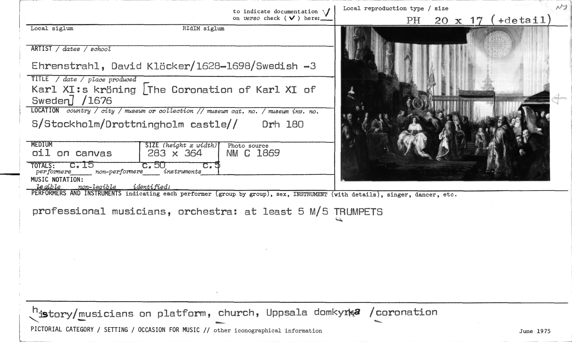 //// professional musicians, orchestra: at least 5 M/5 TRUMPETS //// history/musicians on platform, church, Uppsala domkyrka coronation //// PICTORIAL CATEGORY / SETTING / OCCASION FOR MUSIC // other iconographical information June 1975 //// Photo source //// NM C 1869 //// SIZE (hetght x width) //// 283 x 364 //// oil on canvas //// MEDIUM //// to indicate documentation I on verso check (V ) here; _--_ //// Local siglum RIdIM siglum //// ARTIST / dates / school //// Ehrenstrahl, David Kläcker/1628-1698/Swedish —3 //// TITLE / date / place produced //// Karl XI:s kröning [The Coronation of Karl XI of Sweden] /1676 //// LOCATION country / city / museum or collection // museum cat. no. / museum inv. no. //// S/Stockholm/Drottningholm castle// Orh 180 //// Local reproduction type / size A).") //// PH 20 x 17 (+detail) //// TALS: c.15 c. 511 c. //// perfbrmers instruments //// non-perfbrmers //// MUSIC NOTATION: //// leaible non-leaible identi:.6ed: //// PERFORMERS AND INSTRUMENTS indicating each performer (group by group), sex, INSTRUMENT (with details), singer, dancer, etc. ////