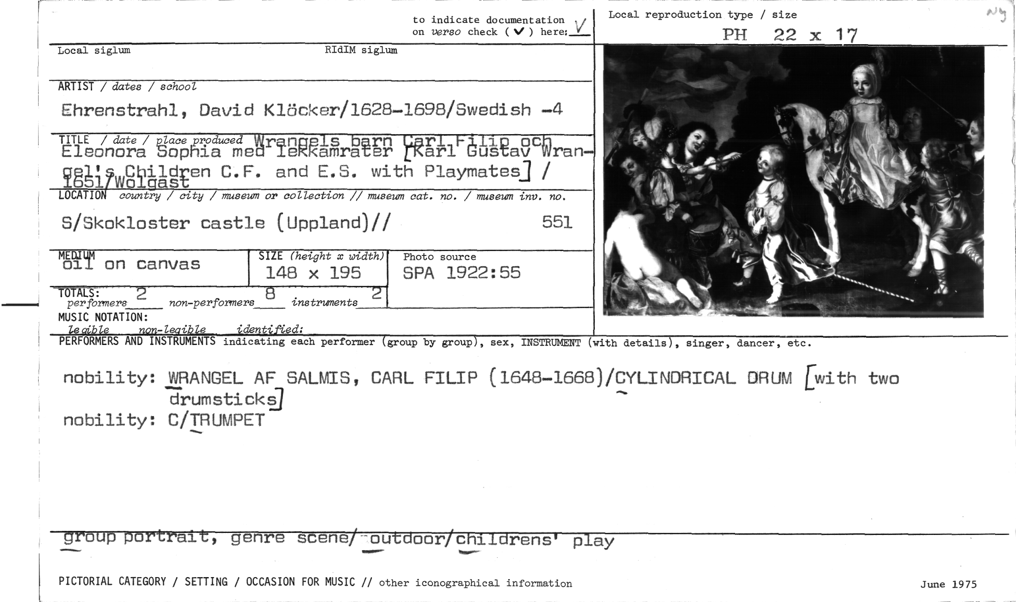 //// 551 //// S/Skokloster castle (Uppland)// //// June 1975 //// PICTORIAL CATEGORY / SETTING / OCCASION FOR MUSIC // other iconographical information //// TITLE / date /late produced Wrannels barn (Inri //// Eleonora Sophia me a leKkamrater [Karl Gustav wran— ygli9w1984en C.F. and E.S. with Playmates] / //// LOCATIO4 country / city / museum or collection // museum cat. no. / museum inv. no. //// MEDIUM //// oii on canvas //// TÖTALS: 2 //// per forners non-perforners instruments //// MUSIC NOTATION: //// SIZE (hetght x width) //// 148 x 195 //// Photo source //// SPA 1922:55 //// PERF RMERS //// ("4-1-•i' e //// AND INSTRUMENTS indicating each per orme //// group by group , sex, INSTRUMENT (with //// details), singer, dancer, etc. //// nobility: WRANGEL AF SALMIS, CARL FILIP (1648-1668)/CYLINDRICAL DRUM [With two arumsticks] //// nobility: C/TRUMPET //// group portrait, genre scene/ outdoodchildrens' play //// Local reproduction type / size //// PIT 22 x //// to indicate documentation !i on verso check (V) here:_l_._ //// otal siglum RIdIM siglum //// ARTIST / dates / school //// Ehrenstrahl, David Klöcker/1628-1698/Swedish —4 ////