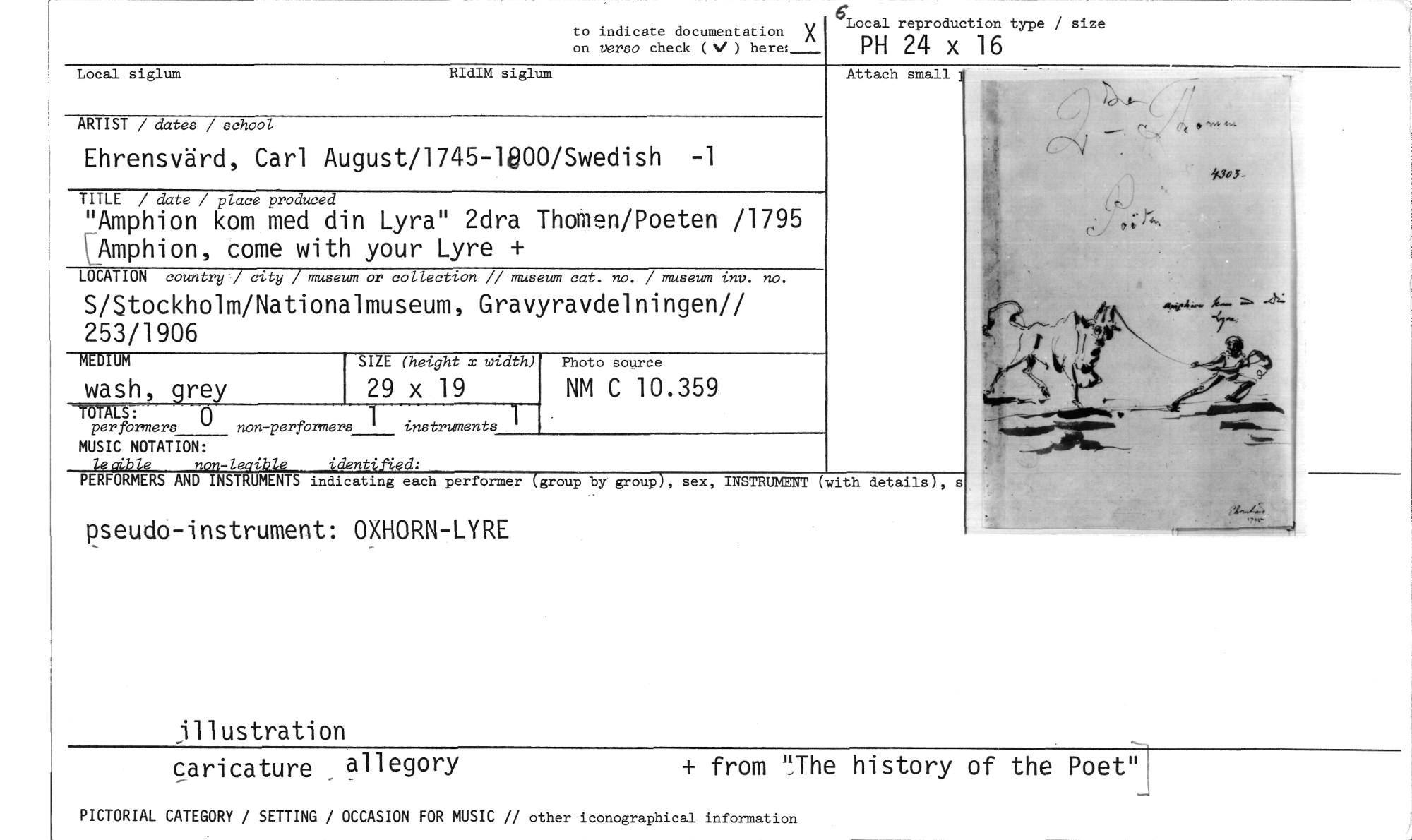//// to indicate documentation X on versa check (N/ ) here:_ //// Local reproduction type / size //// PH 24 x 16 //// Local siglum RIdIM siglum //// ARTIST / dates / school //// Ehrensvärd, Carl August/1745-1e00/Swedish -1 //// TITLE / date / place produced //// "Amphion kom med din Lyra" 2dra Thumen/Poeten /1795 \Amphion, come with your Lyre + //// LOCATION country / city / museum or collection // museum cat. no. / museum inv. no. //// S/Stockholm/Nationalmuseum, Gravyravdelningen// 253/1906 //// MEDIUM //// wash, •re //// per formers //// LS: 0 non-performers instruments //// MUSIC NOTATION: //// leaible non-leaible identified: //// PERFORMERS AND INSTRUMENTS indicating each performer (group by group), sex, INSTRUMENT (with details), s //// pseudo-instrument: OXHORN-LYRE //// Attach small 1 //// SIZE (height x width) //// 29 x 19 //// Photo source //// NM C 10.359 //// illustration + from "The history of the Poetul //// caricature allegory //// PICTORIAL CATEGORY / SETTING / OCCASION FOR MUSIC // other iconographical information ////