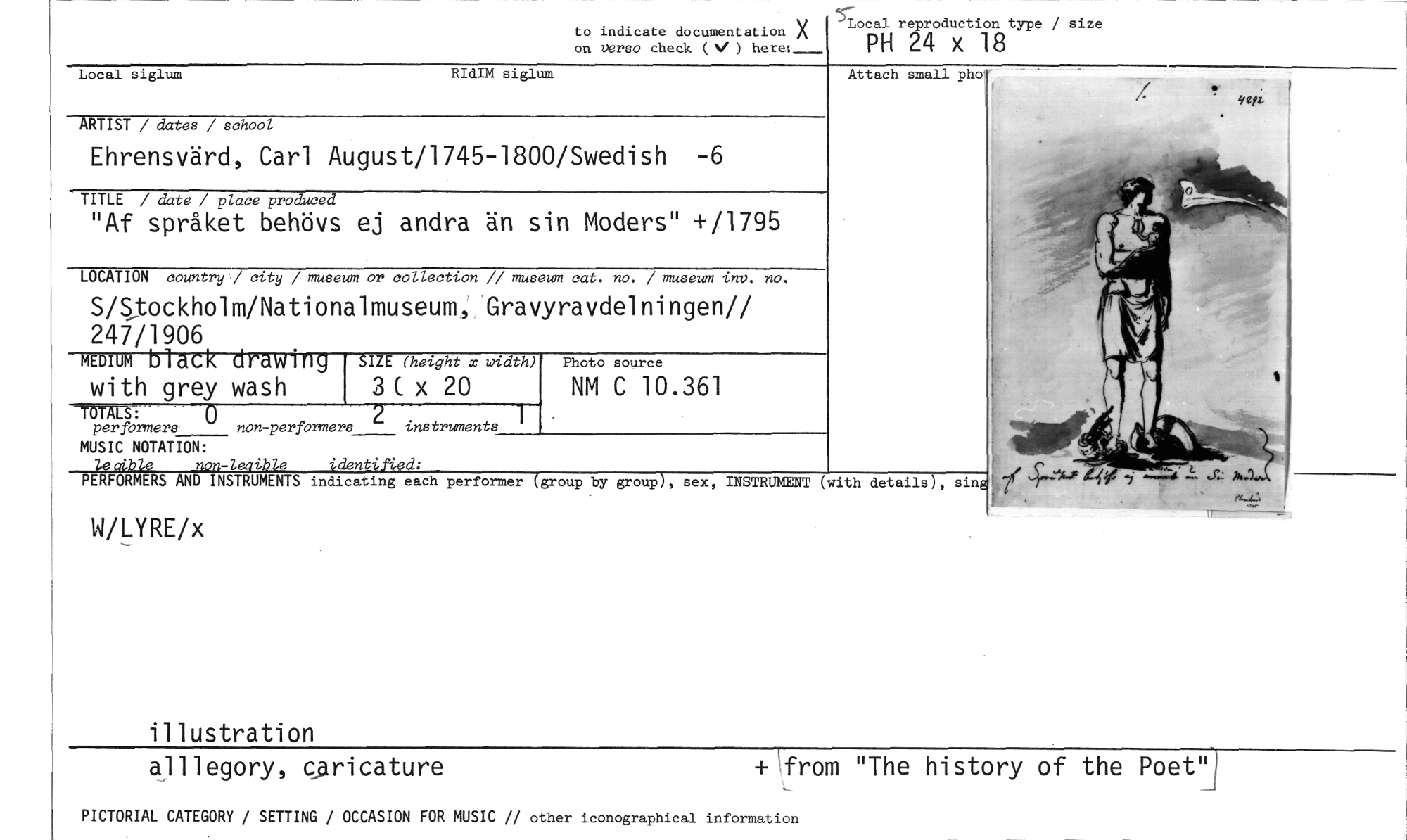 //// to indicate documentation X on versa check ) here: //// S Local reproduction type / size //// PH 24 x 18 //// Attach small pho //// Yeft //// ARTIST / dates / school //// Local siglum RIdIM siglum //// Ehrensvärd, Carl August/1745-1800/Swedish -6 //// TITLE / date / place produced //// "Af språket behövs ej andra än sin Moders" +11795 //// LOCATION country / city / museum or collection // museum cat. no. / museum inv. no. //// S/Stockholm/Nationalmuseum, Gravyravdelningen// 247/1906 //// MEDIUM black drawing SIZE (height x width) //// with grey wash 3 C x 20 //// per forners non-peribrmers instruments //// MUSIC NOTATION: //// lesible non-legible identified: //// PERFORMERS AND INSTRUMENTS indicating each performer (group by group), sex, INSTRUMENT (with details), sing //// W/LYRE/x //// illustration //// Photo source //// NM C 10.361 //// F //// alllegory, c_aricature +krom "The history of the Poet"i //// PICTORIAL CATEGORY / SETTING / OCCASION FOR MUSIC // other iconographical information ////