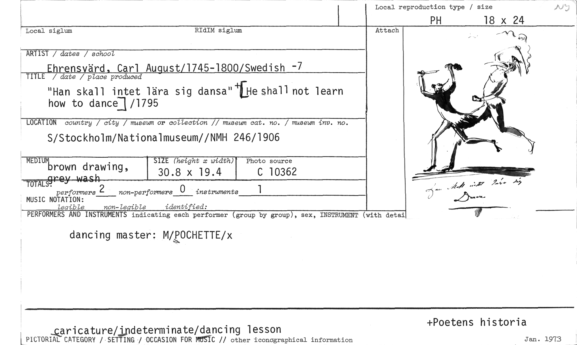 //// +Poetens historia //// Jan. 1973 //// 4p-icuturle/jUncieberyninate/dancing 1 esson //// PICTORIAL CATEGORY /SETTING •OCCASION FOR MCSIC // other iconugraphical information //// non-per formers 0 //// instruments //// Local siglum RIdIM siglum //// ARTIST / dates / school //// Ehrensvärd, Carl August/1745-1800/Swedish -7 //// TITLE / date / place produced //// "Han skall intet lära sig dansa"tHe shall not learn how to dance:1/1795 //// LOCATION country / city / museum or collection // museum cat. no. / museum inv. no. //// S/Stockholm/Nationalmuseum//NMH 246/1906 //// SIZE (height x width) //// 30.8 x 19.4 //// Local reproduction type / size //// PH 18 x 24 //// MEDIUM //// brown drawing, ey_wash //// WITEsg //// performers 2 //// MUSIC NOTATION: //// Photo source //// C 10362 1 //// leqible non-leqible identified: //// PERFORMERS AND INSTRUMENTS indicating each performer (group by group), sex, INSTRUMENT (with detai //// dancing master: M/ZOCHETTE/x //// Attach ////